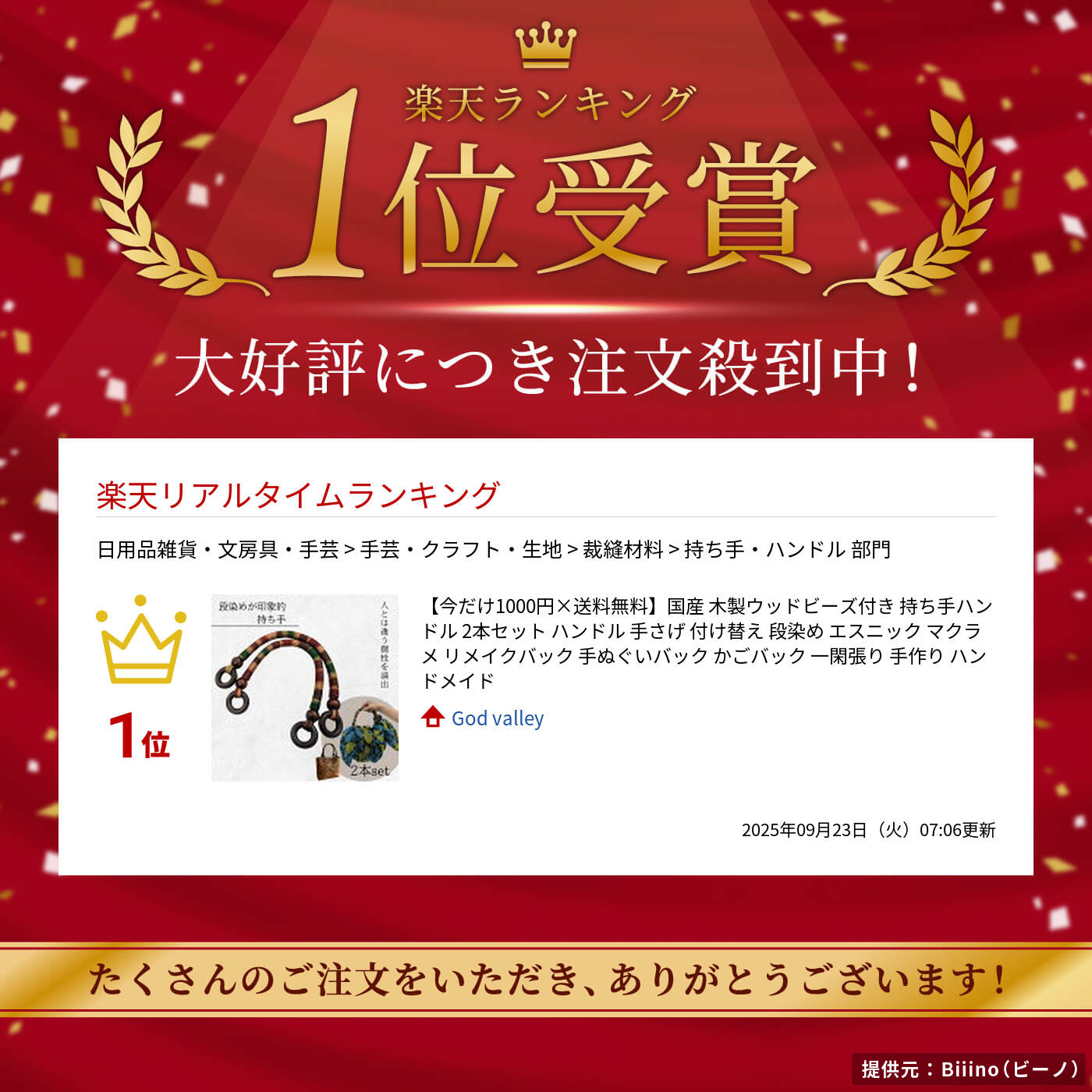 商品情報素材/材質【素材】 ウッドビーズ 段染め ナイロンサイズ/寸法全長 38cm/45cm2本セットその他商品説明国産の木製ウッドビーズ付き持ち手ハンドルの2本セットです。エスニックな段染めデザインが特徴で、マクラメやリメイクバッグ、手ぬぐいバッグ、かご一閑張りなど、さまざまな手作りバッグにぴったりです。付け替えが簡単で、バッグの印象を手軽に変えることができます。ハンドメイド作品に温かみと個性をプラスし、オリジナルのバッグ作りを楽しむ方に最適なアイテムです。国産品質の木製ハンドルで、安心してご使用ください。注意ロット違い生産時期により、色味違いサイズの違いが生じる場合がございます。モニター発色の具合により色合いが異なる場合がございます。サイズ新サイズ登場! ご要望にお応えして、新たに全長45cmのサイズを追加させていただきました♪ ウッドリングはそのままで全長を伸ばしております。 少し大きめのバックにもお使い頂けるようになりました。