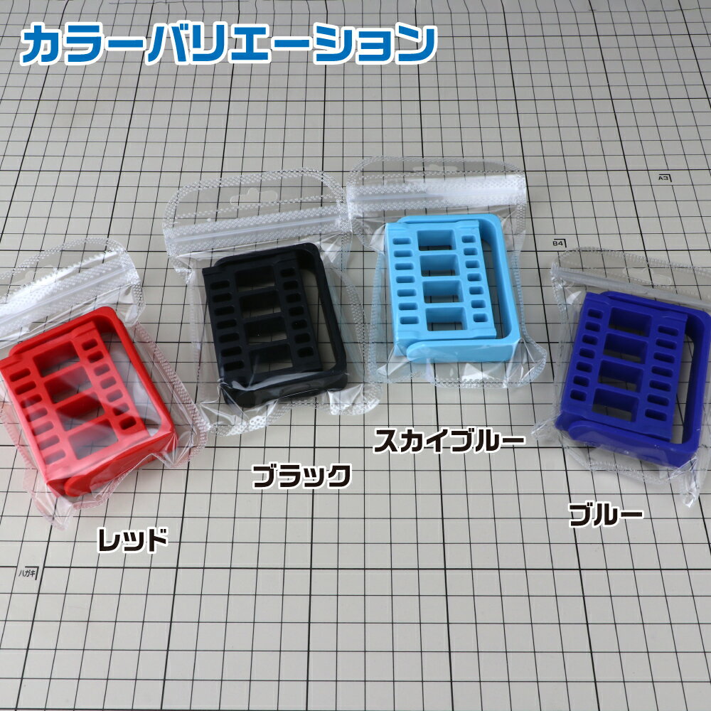 使用シーンに合わせて、2つのモードに完全変形! 作業机でつかうときは、ビットの角度を調節すると、先端工具が取り出しやすくなり、作業効率UPします。 このビットスタンドは、手のひらサイズなので、ツールケースに入れて持ち運ぶことができます。 場所を取らず、作業の邪魔にもなりません。 ビットの長さに合わせて、バーの位置を適切に変更できる! ※本商品にはビットは付属しておりません。 先端工具の整理整頓に便利なビットスタンドです。 保護バーの高さを変えることで、先端工具の長さに合わせて、安全かつ見やすく管理することができます。 Φ2.35mm軸用の穴が16個開いており、先端工具を並べて整理しておくことができます。 バーとビットの隙間は小さくしよう! ビットをより良く保護するために、各ビットの先端とバーとの間の隙間があまりできないようにしましょう。 先端工具は整理整頓しておこう! ミニルーターなどの先端工具(先端パーツまたはビットともいう)を作業台の上などにバラバラにしながら作業すると、先端パーツの破損や曲がり、欠け、紛失などが起きやすくなり、使用時に支障をきたすことがあります。 また、思わぬ場所に先端工具が転がっていると、知らずに手を伸ばしてケガをするおそれもあります。 作業を安全かつ順調に行うためには、先端工具の整理整頓が必要です。 仕様 ・カラー:ブルー、ブラック、レッド、スカイブルー から選択 ・サイズ:縦50mm×横70mm×高さ15mm ・Φ2.35mm軸用 ・16穴 [!]注意事項 ・穴よりも太い軸を差し込まないでください。無理に穴に押し込むと、パーツスタンドから軸が抜けなくなりますので十分ご注意ください。 ・本商品にはビットは付属しておりません。 ・先端工具で指や手などをケガしないよう十分注意してください。 各種ルータービットはこちら
