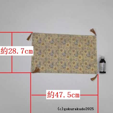経机の天板面に掛けます金襴製の布で『経机掛け』と呼ばれています。 別に経机専用というわけでなく、ちょっとした場所を設けて簡略なお祀りをされる場合の敷物としても、良く用いられています。 4隅に房付き。 一応防炎処理がされていますがあくまで金襴ですから火の用心はお願いします。 裏地は白です。 *サイズは画像の寸法表示をご参照よろしくおねがいします。 *このサイズはクロネコゆうバケットでも発送可能ですが折り曲げることになりますので折り癖がつくのをご了承ください。 *代引き以外。要:発送方法を追跡可能メール便(クロネコゆうバケット)に変更 注:微妙にサイズ制限にかかってしまうので、ネコポス発送はできません。 (宅急便発送の場合は折り曲げず、平面の状態で発送します。)