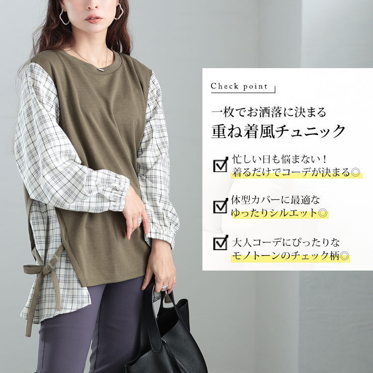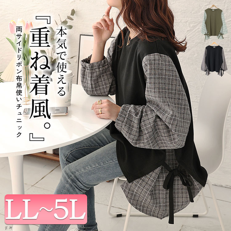大きいサイズレディース チュニック サイドリボンフェイクレイヤードチュニック 長袖 フェイクレイヤード チェック柄 リボン サイドリボン ベスト テールカット クルーネック 重ね着風 ストレッチ 伸縮 スリット 冬新作 春服 秋服 3L 4L ブラック 黒 カーキ ゴールドジャパン