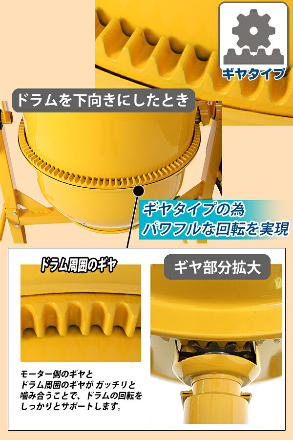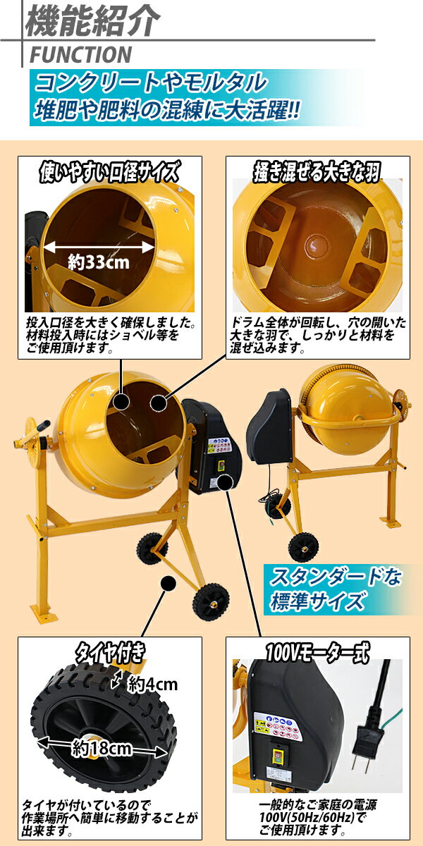 送料無料 新品 コンクリートミキサー 黄 練上量60L ドラム容量120L 電動 モーター式 100Vモーター 混練機 攪拌機 かくはん機 コンクリート モルタル 堆肥 肥料 飼料 園芸 タイヤ 車輪 キャスター ミキサー 攪拌 かくはん 混錬 混ぜる 練る イエロー YELLOW