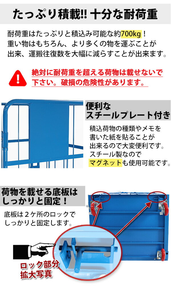 本体寸法 約95(幅)x約80(奥行)x約170(高さ)(cm) 内寸 約89(幅)x約77(奥行)x約146(高さ)(cm) 底板 約86(幅)x約76(奥行)(cm) 耐荷重 約700kg 材質 スチール(本体)、PU(ポリウレタン)(キャスター) 商品について ●こちらの商品は、新品ではありますが、輸入品につき、多少のスリ傷等ある場合もございます。 ●気になさる方は購入をお控え下さい。 配送について ●全国一律、送料無料です。 (ただし、北海道、東北(青森県、秋田県、岩手県、山形県、宮城県、福島県)、沖縄、離島の方は、除きます。別途お見積もり致します。) ★1階車上でのお渡しとなります。恐れ入りますが荷降ろし・搬入は、お客様にてお願い致します。 ●また、開梱や組立・設置等の対応はできませんので、予めご了承下さい。 クレーム品について ◆弊社は、出荷時に、検品を致して出荷しております。 ●万が一、商品に不具合がございましたら、商品到着日より7日以内に画像添付の上、ご連絡下さい。 ●7日以内にお知らせ頂けない場合、クレームの対応は出来ません。 ●配達時の状態に梱包の上、車上までお持ち願います。 ■搬入方法を十分ご検討の上、ご購入下さい。 ■実際の商品と上記の写真の色は、照明の関係上若干異なる場合があります。ご理解の上ご購入下さい。 ■直接のお引取りは、弊社の倉庫管理、在庫管理システム上ご遠慮いただいております。 ■吊り上げ作業などの搬入手配は、弊社では、受付しておりません。お客様ご自身で手配願います。 ■設置場所に、搬入可能かどうか、間口、廊下、エレベーター等のサイズなどは、必ずご確認下さい。 ■配送後のキャンセルは、一切お受け出来ません。よくご検討された上で、ご購入下さい。 ●商品をご確認されますまで、梱包材は保管願います。 ●万が一、商品交換をご希望されます場合は(到着後7日以内)お客様で、梱包材のご準備をお願い致します。 ●梱包材をご希望の場合は、梱包材+送料をご請求させて頂きます。 ※商品を到着時のように梱包をして頂き、1階車上まで運んで頂きますよう 宜しくお願い致します。送料無料 新品 観音扉カゴ台車 カゴ車 青 W95×D80×H170(cm) 耐荷重700kg 2ドア 扉付き かご台車 ロールボックス ロールパレット パレット 看板スチールプレート 観音開き 業務用 業務用台車 大型台車 倉庫 運搬 物流 950×800×1700 キャスター ブルー cago2doorbluew95 下記サイズもございます。 ※下記サイズをクリックすると詳細ページに移動します。 サイズ 約 W(幅)×D(奥行)×H(高さ)cm W80×D60×H170 W95×D80×H170 W110×D80×H170 ◇◇◇観音扉 カゴ台車◇◇◇ ●耐荷重性・耐磨耗性に優れたPUキャスターを使用。ゴムやプラスチックに比べて丈夫で、壊れにくく、横滑りや、床面への損傷を最小限に抑えます。 ●観音扉の中央部と下部にはロック機能を標準搭載。 扉をしっかり固定し、荷崩れを防止!万が一の落下、怪我を防ぎます。 ●広々とした倉庫内などでの使用に適しているAタイプ、狭い場所での使用に適しているCタイプをご用意。 ●両タイプともキャスターにはストッパー付き。勾配のある場所での誤作動による商品落下・破損・怪我を防止します。 ●サイズは3種類をご用意。ご使用頂ける環境に合わせてお選び下さい。 ●オプション(別売り)として、棚板、防塵カバー、保冷カバーを販売しております。 (保冷カバー使用時は棚板をご使用頂けません。) ●内寸…約89(幅)x約77(奥行)x約146(高さ)(cm) ●底板…約86(幅)x約76(奥行)(cm) ●キャスター径:約15cm ●耐荷重:約700kg ●重量:約60kg ※組立式(大人2人で組立てられます)。最初はネジを仮締めして組立て、最後にしっかりと締めるようにして下さい。