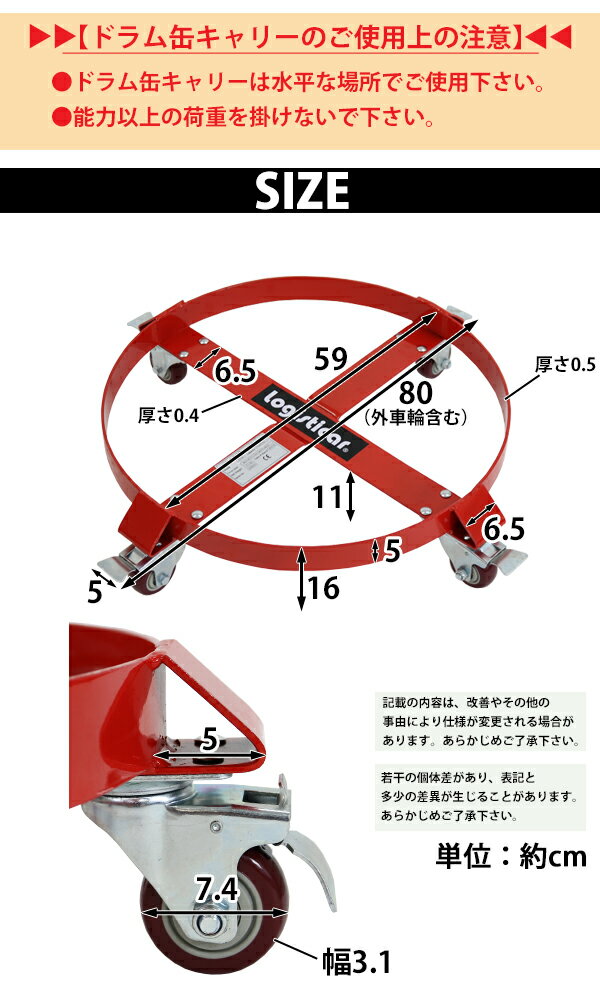 ※法人・事業所の方は、お届け先又は備考欄に必ず法人・事業所名をご記入ください!!! 本体寸法 ●全体:W約80×D約80×H約16(cm) 商品について ●こちらの商品は、新品ではありますが、輸入品につき、多少のスリ傷等ある場合もございます。 ●気になさる方は購入をお控えください。 配送について ●全国一律送料無料(但し、北海道へ配送の場合代金3,980円(税込)未満、沖縄・離島へ配送の場合代金9,800円(税込)未満の場合に送料をご負担いただきます。別途お見積り致します。)です。 ★1階車上でのお渡しとなります。恐れ入りますが荷降ろし・搬入は、お客様にてお願い致します。 ●また、開梱や組立・設置等の対応はできませんので、予めご了承下さい。 クレーム品について ◆弊社は、出荷時に、検品を致して出荷しております。 ●万が一、商品に不具合がございましたら、商品到着日より7日以内に画像添付の上、ご連絡ください。 ◆7日以内にお知らせ頂けない場合、クレームの対応は出来ませんのでご了承ください。 ●商品交換の場合は、配達時の状態に梱包の上、車上までお持ち願います。 ■搬入方法を十分ご検討の上、ご購入ください。 ■実際の商品と上記の写真の色は、照明の関係上若干異なる場合があります。ご理解の上ご購入ください。 ■直接のお引取りは、弊社の倉庫管理、在庫管理システム上ご遠慮いただいておりますので、ご了承ください。 ■吊り上げ作業などの搬入手配は、弊社では、受付しておりません。お客様ご自身で手配願います。 ■設置場所に、搬入可能かどうか、間口、廊下、エレベーター等のサイズなどは、必ずご確認ください。 ■配送後のキャンセルは、一切お受け出来ません。よくご検討された上で、ご購入ください。 ■ご購入後、お客様ご都合によるご返品、ご返金等は一切お受け致しておりませんので、予めご了承下さいませ。 ◆商品購入にあたっての注意事項◆ ●本商品を使用した際に発生したトラブル、事故につきまして、当社は一切の責任を負いません。 ご使用に関しましては、全て自己責任にてお願い致します。 ●ご使用前に、必ず取扱い説明書をご確認の上、十分理解して本機をご使用下さい。 ●商品をご確認されますまで、梱包材は保管願います。 ●万が一、商品交換をご希望されます場合は(到着後7日以内)お客様で、梱包材のご準備をお願い致します。 ●梱包材をご希望の場合は、梱包材+送料をご請求させて頂きます。送料無料 新品 ドラム缶キャリー 定格荷重400kg 全キャスターストッパー付き スチール 赤 ドラム缶用キャリー ドラム缶ドーリー 円形台車 ドラム缶 運搬車 台車 ドラム台車 キャリー ドラムキャリー カート 丸型 運送 ドラム缶運搬車 RED レッド drumcarry55b ★ドラム缶キャリーのご紹介です★ ●簡単な操作で、ドラム缶をラクラク運搬!! ●キャスターの材質は、PU(ポリウレタン)を使用しています。スムーズで耐久性にも優れており、音も比較的静か。自在キャスターなので、旋回しやすく、スムーズに運べます。 ●全てのキャスターに、ストッパー付き。 ■車輪径:約7.4cm ■定格荷重:約400kg ■適合機種:200Lドラム缶 ■本体重量:約9kg ■材質:スチール(本体)、PU(ポリウレタン)(キャスター) ■英語説明書付き。 ※本体とキャスター部分を取り付けるのみの組立て式です。 (組立てには13mmのスパナが必要です。お客様でご用意下さい。) ※ドラム缶は商品には含まれておりません。 ★ご購入前の注意事項★ ★1階車上でのお渡しとなります。荷降ろし・搬入は、お客様にてお願いいたします。 ●新品商品ではありますが、輸入商品の為、多少の擦り傷などがある場合がございますので、 ご納得の上ご購入下さいませ。 ●ご購入後、お客様ご都合によるご返品、ご返金等は一切お受け致しておりません。 ●本商品を使用した際に発生したトラブル、事故につきまして、当社は一切の責任を負いません。 ご使用に関しましては、全て自己責任にてお願い致します。