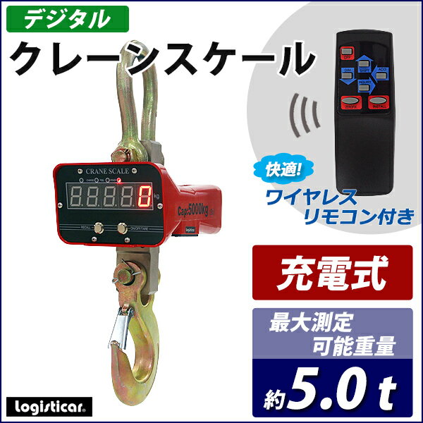 送料無料 デジタルクレーンスケール PSE適合 最大測定可能重量約5t リモコン付き 充電式 防滴 防塵 精密 計量 無線 ワイヤレス 吊りはかり 吊り秤 吊秤 電子秤 吊り下げ クレーン フック 玉掛け 吊り上げ 重機 コンパクト 天秤 天びん 5000kg 赤 レッド cscalecs5000red