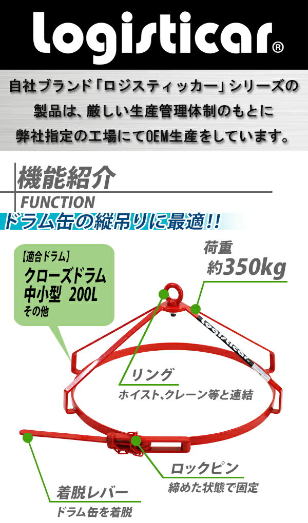 ※お届け先又は備考欄に必ず法人・事業所名をご記入ください!!! 本体寸法 約W70×約D61×約H34(cm) 梱包サイズ 約W68×約D67×約H37(cm) 本体重量 約5.7kg 材質 【本体】スチール(炭素鋼) 商品について ●こちらの商品は、新品ではありますが、輸入品につき、多少のスリ傷等ある場合もございます。 ●気になさる方は購入をお控えください。 配送について ●全国一律送料無料です。 (ただし、北海道、東北(青森県、秋田県、岩手県、山形県、宮城県、福島県)、沖縄、離島の方は、除きます。別途お見積もり致します。) ★1階車上でのお渡しとなります。恐れ入りますが荷降ろし・搬入は、お客様にてお願い致します。 ●また、開梱や組立・設置等の対応はできませんので、予めご了承下さい。 クレーム品について ◆弊社は、出荷時に、検品を致して出荷しております。 ●万が一、商品に不具合がございましたら、商品到着日より7日以内に画像添付の上、ご連絡ください。 ◆7日以内にお知らせ頂けない場合、クレームの対応は出来ませんのでご了承ください。 ●商品交換の場合は、配達時の状態に梱包の上、車上までお持ち願います。 ■搬入方法を十分ご検討の上、ご購入ください。 ■実際の商品と上記の写真の色は、照明の関係上若干異なる場合があります。ご理解の上ご購入ください。 ■直接のお引取りは、弊社の倉庫管理、在庫管理システム上ご遠慮いただいておりますので、ご了承ください。 ■吊り上げ作業などの搬入手配は、弊社では、受付しておりません。お客様ご自身で手配願います。 ■設置場所に、搬入可能かどうか、間口、廊下、エレベーター等のサイズなどは、必ずご確認ください。 ■配送後のキャンセルは、一切お受け出来ません。よくご検討された上で、ご購入ください。 ■ご購入後、お客様ご都合によるご返品、ご返金等は一切お受け致しておりませんので、予めご了承下さいませ。 ◆商品購入にあたっての注意事項◆ ●本商品を使用した際に発生したトラブル、事故につきまして、当社は一切の責任を負いません。 ご使用に関しましては、全て自己責任にてお願い致します。 ●商品をご確認されますまで、梱包材は保管願います。 ●万が一、商品交換をご希望されます場合は(到着後7日以内)お客様で、梱包材のご準備をお願い致します。 ●梱包材をご希望の場合は、梱包材+送料をご請求させて頂きます。 ※商品を到着時のように梱包をして頂き、1階車上まで運んで頂きますよう 宜しくお願い致します。送料無料 ドラム缶吊り具 荷重約350kg スチール 赤 ドラム缶縦吊り具 ドラム缶吊具 ドラム吊り具 ドラム吊具 縦吊り 縦吊 ドラム缶縦吊りクランプ ドラム缶 運搬 ドラムキャリー ドラムリフター クレーン ホイスト リフト リフター 運送 レッド drumclamplg350 ★スチール製ドラム缶吊り具のご紹介です★ ●簡単に取り付け、ドラム缶の縦吊りに最適!! ●ドラム缶のチャイム(縁)の下部分で固定し、クレーン・ホイスト等の荷役装置に連結して、吊り上げを行います。 ●ロックピン付きで、ドラム缶を締めた状態で固定できるので安全性に優れています! ●約350kgの吊り下げができるスチール製の頑丈な作りです! ■荷重:約350kg ■適合機種:クローズドラム、中小型、200L、その他ドラム缶 ※プラスチックドラムには使用できません。 ■本体重量:約5.7kg ■材質:【本体】スチール(炭素鋼) ※こちらの商品は完成品になります。 ※ドラム缶は商品には含まれておりません。 ★ご購入前の注意事項★ ★1階車上でのお渡しとなります。荷降ろし・搬入は、お客様にてお願いいたします。 ●新品商品ではありますが、輸入商品の為、多少の擦り傷などがある場合がございますので、 ご納得の上ご購入下さいませ。 ●ご購入後、お客様ご都合によるご返品、ご返金等は一切お受け致しておりません。 ●本商品を使用した際に発生したトラブル、事故につきまして、当社は一切の責任を負いません。 ご使用に関しましては、全て自己責任にてお願い致します。