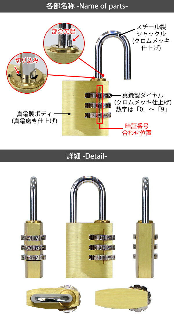 ※こちらの商品は代金引換がご利用できません。ご注文時に代引き以外のお支払方法をお選び下さい。 本体寸法 約W26×約D57×約H13.5(mm)(1個あたり) 梱包サイズ 約W175×約D120×約H20(mm)/約600g 重量 約55g(1個あたり) 材質 スチール(クロムメッキ仕上げ)(シャックル)、真鍮(クロムメッキ仕上げ)(ダイヤル)、真鍮(真鍮磨き仕上げ)(本体) 商品について ●こちらの商品は、新品ではありますが、輸入品につき、多少のスリ傷等ある場合もございます。 ●気になさる方は購入をお控え下さい。 送料について ●全国一律送料無料(但し、北海道へ配送の場合代金3,980円(税込)未満、沖縄・離島へ配送の場合代金9,800円(税込)未満の場合に送料をご負担いただきます。別途お見積り致します。)です。 ★1階車上でのお渡しとなります。恐れ入りますが荷降ろし・搬入は、お客様にてお願い致します。 ●また、開梱や組立・設置等の対応はできませんので、予めご了承下さい。 クレーム品について ●弊社は、出荷時に、検品を致して出荷しております。 ●万が一、商品に不具合がございましたら、商品到着日より7日以内に画像添付の上、ご連絡下さい。 ●7日以内にお知らせ頂けない場合、クレームの対応は出来ませんのでご了承下さい。 ●商品交換の場合は、配達時の状態に梱包の上、車上までお持ち願います。 ■搬入方法を十分ご検討の上、ご購入下さい。 ■実際の商品と上記の写真の色は、照明の関係上若干異なる場合があります。ご理解の上ご購入下さい。 ■直接のお引取りは、弊社の倉庫管理、在庫管理システム上ご遠慮いただいておりますので、ご了承下さい。 ■吊り上げ作業等の搬入手配は、弊社では、受付しておりません。お客様ご自身で手配願います。 ■設置場所に、搬入可能かどうか、間口、廊下、エレベーター等のサイズ等は、必ずご確認下さい。 ■配送後のキャンセルは、一切お受け出来ません。よくご検討された上で、ご購入下さい。 ■ご購入後、お客様ご都合によるご返品、ご返金等は一切お受け致しておりませんので、予めご了承下さいませ。 ●商品をご確認されますまで、梱包材は保管願います。 ●万が一、商品交換をご希望されます場合は(到着後7日以内)お客様で、梱包材のご準備をお願い致します。 ●梱包材をご希望の場合は、梱包材+送料をご請求させて頂きます。 ※商品を到着時のように梱包をして頂き、1階車上まで運んで頂きますよう 宜しくお願い致します。 ◆商品購入にあたっての注意事項◆ ●本商品を使用した際に発生したトラブル、事故につきまして、当社は一切の責任を負いません。 ご使用に関しましては、全て自己責任にてお願い致します。 ●ご使用前に、必ず取扱い説明書をご確認の上、十分理解して本機をご使用下さい。送料無料 ダイヤル式 南京錠 幅約25mm 10個セット シャックル径約4mm 真鍮 3桁タイプ 可変式 ダイヤルロック ダイヤル錠 コンビネーション パド ロック ガードロック チェンジロック 盗難防止 防犯 暗証番号 宅配ボックス ロッカー ポスト キャリーケース フック nankinl2510p ■◆ダイヤル式南京錠◆■ ■お好きな暗証番号を自由に設定できるダイヤル式南京錠! ■宅配ボックス、キャリーケース、ロッカー、ポストなどの施錠等色々な場面でご使用いただけます。 ■3桁のダイヤルでロックするため、鍵を持ち運ぶ必要がありません。暗証番号の変更は何度でも可能です。 ■真鍮製の南京錠で、シャックルやダイヤルにはクロムメッキ仕上げが 施され錆びにくい仕様になっています。 ■重量:約55g(1個あたり) ■材質:スチール(クロムメッキ仕上げ)(シャックル)、真鍮(クロムメッキ仕上げ)(ダイヤル)、真鍮(真鍮磨き仕上げ)(本体) ※こちらの商品はTSAロック仕様ではございません。 ■個数:10個 ■日本語説明書付き ★ご購入前の注意事項★ ●こちらの商品は代金引換がご利用できません。ご注文時に代引き以外のお支払方法をお選び下さい。 ★1階車上でのお渡しとなります。恐れ入りますが荷降ろし・搬入は、お客様にてお願い致します。 ●新品商品ではありますが、輸入商品の為、多少の擦り傷などがある場合がございますので、ご納得の上ご購入下さいませ。 ●ご購入後、お客様ご都合によるご返品、ご返金等は一切お受け致しておりません。 ●本商品を使用した際に発生したトラブル、事故につきまして、当社は一切の責任を負いません。ご使用に関しましては、全て自己責任にてお願い致します。 ●ご使用前に、必ず取扱い説明書をご確認の上、十分理解して本機をご使用下さい。