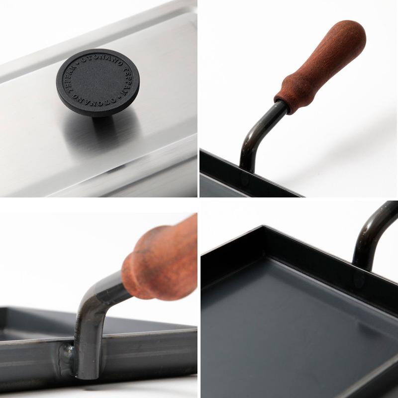 大人の鉄板 鉄板小 蓋付き OTS8100 調理してそのまま食卓へ!手軽に使える片手ハンドル。 材質:鉄(シリコン塗装)・天然木(オイル仕上げ)・蓋/ステンレス鋼(クロム18%)、アルミニウム合金(フッ素樹脂塗膜加工) 機能:ガス火、IH200V対応 セット内容:レシピ・取説 重量:2.4kg 容量:0.8L 本体サイズ:420×160×95mm パッケージサイズ:485×185×115mm パッケージ:段ボール箱