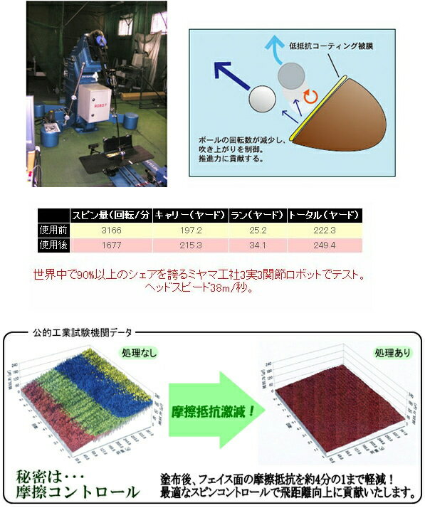 クラブフェースに直接スプレーし、付属のクロスで伸ばして広げるだけでフェース面をコーティング。ボールのスピン量を約47%抑え、圧倒的な飛距離アップを実現。その秘密は「摩擦コントロール」。塗布後、フェイス面の摩擦抵抗を約4分の1まで軽減してボールの吹き上がりを低減。さらにスライスとフック回転も抑制され無駄な曲がりも減少。方向性も安定し飛距離アップにつながる。最適なスピンコントロールにより、理想のドライバーショットを実現します。 ・無駄なスピンが減少・キャリーが伸びる・曲がりが小さくなる・ランが長くなる※当スプレーでコーティングを施したクラブは、公式競技では使用できません。※本製品は飛距離を約束するものではございません。 ※皮膜の持続時間について (取扱い説明書より抜粋)コーティング皮膜の持続は、ボールがフェイス面の同一場所に当たらない限り、約1ラウンドの持続性がありますが、技術レベルにより、同一場所へボー ルが集中する場合、効果が現れ難い場合があります。より高い効果を得るにはハーフラウンドごとの使用をお勧めいたします。 ●内容量 :27ml●成分 :硬質シリカファイバー、特殊重合ポリマー●液性 :中性●専用クロス付き●生産国 :日本 ※ご注意:モニターの発色の具合によって実際のものと色が異なる場合がございます ドライバーに一吹きするだけで飛距離と方向性を向上させる魔法のスプレー 飛距離アップ コーティングスプレー <ミヤマエ社製ロボットでのテスト>クラブフェースに直接スプレーし、付属のクロスで伸ばして広げるだけでフェース面をコーティング。ボールのスピン量を約47%抑え、圧倒的な飛距離アップを実現。その秘密は「摩擦コントロール」。塗布後、フェイス面の摩擦抵抗を約4分の1まで軽減してボールの吹き上がりを低減。さらにスライスとフック回転も抑制され無駄な曲がりも減少。方向性も安定し飛距離アップにつながる。最適なスピンコントロールにより、理想のドライバーショットを実現します。 ・無駄なスピンが減少・キャリーが伸びる・曲がりが小さくなる・ランが長くなる※当スプレーでコーティングを施したクラブは、公式競技では使用できません。※本製品は飛距離を約束するものではございません。 ※皮膜の持続時間について (取扱い説明書より抜粋)コーティング皮膜の持続は、ボールがフェイス面の同一場所に当たらない限り、約1ラウンドの持続性がありますが、技術レベルにより、同一場所へボー ルが集中する場合、効果が現れ難い場合があります。より高い効果を得るにはハーフラウンドごとの使用をお勧めいたします。 ●内容量 :27ml●成分 :硬質シリカファイバー、特殊重合ポリマー●液性 :中性●専用クロス付き●生産国 :日本