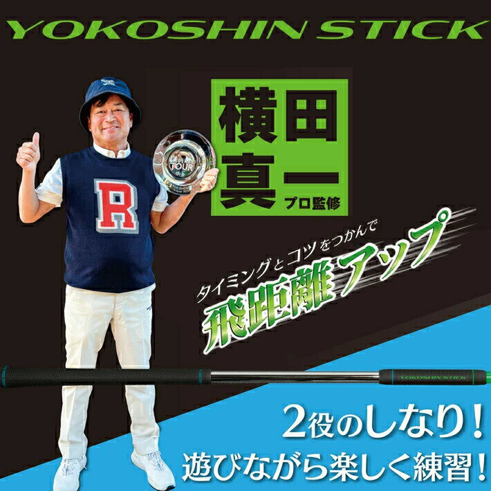 検索キーワード:ゴルフ練習 スイング 練習 練習スティック ゴルフシャフト ゴルフクラブシャフト 43.5インチシャフト ゴルフスイング練習 練習器具 アプローチ 練習 練習アイテム 長さ43.5インチ総重量530gバランスA0以下/E2(持ち方によってバランスが異なります。)シャフトオリジナルスチールシャフト+POM樹脂シャフトグリップオリジナルラバーグリップ生産国日本製横田真一プロが考案・監修したゴルフスイング練習器具、その名も、ヨコシンスティック! 1本のスティックに異なる2種類のシャフトを装着することによって、5つの効果を実現。工夫次第で使い方は無限大です。 主に、シャフトのしなりを活かしてスイングを安定させ、方向性や飛距離、ヘッドスピードを向上。アプローチの感覚や適切なボールポジションを養うなど、遊び感覚で楽しみながらスイング練習ができます。 キャディバッグに入る43.5インチ。★1本のスティックに異なるシャフトを搭載! ・POM樹脂シャフト ・スチールシャフト 重量感(バランス)やしなり具合が異なります!★2役のしなり ・ネバースライス=スライスとはおさらば! 樹脂シャフト側のグリップを持ち、しなり戻りの感覚を習得。 無理にボールを捕まえようとせず、シャフトのしなりを活かしてフェースローテーションを行うことで、方向性が安定します。 ・スピードアップ=プロはシャフトを活かして飛距離を伸ばします! 樹脂シャフト側のグリップを持ち、インパクト前で手を止めるとヘッドが加速します。 スチールシャフト側で速いスイングを練習し、スピード感を養いましょう。 1日5〜10回スイングがおすすめです。 ★ボールポジション 両サイドのグリップ位置でつま先の位置やスタンスの広さを確認できます。 センターグリップの位置でボールポジションをチェックできます。★アプローチ スチールシャフト側に内蔵されたウエイトでアプローチのスイング練習が可能。 センターグリップを握り、ハンドファーストでアドレスし、体の回転でスイングしましょう。 樹脂シャフトが脇腹に触れないように意識し、フェースローテーションは使わずに練習します。★ストレッチ 前屈や体側(たいそく)を伸ばします。 センターグリップを持って手首のストレッチができます。 ★+アルファ 片手でセンターグリップを持ちシェークすると腕の筋力アップになります。 工夫次第で自分に合った練習方法が見つかるかもしれません!