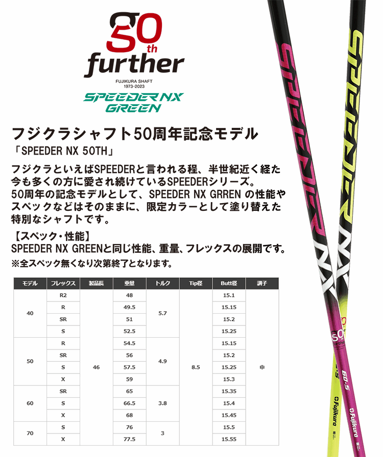 【G440対応】【全てメーカー純正部品使用】【PING ウッド用 純正 スリーブ付きシャフト】フジクラ スピーダー NX 50th (フジクラシャフト50周年記念限定カラー) (Fujikura Speeder NX 50Th Ltd Color Ver.)