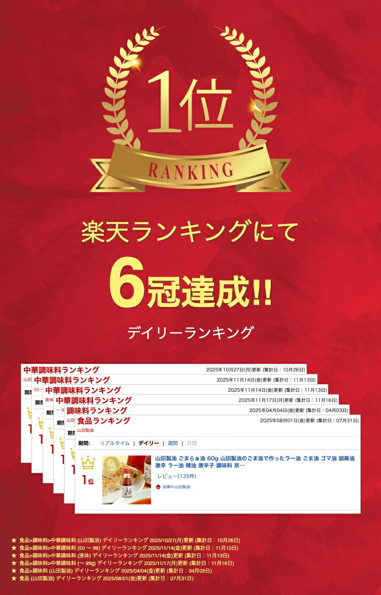 ◆TVで紹介されました 2022年1月7日「よ〜いドン!」『となりの人間国宝さん』 2023年3月7日『かんさい情報ネットten.』 【一番絞りごま油×国産唐辛子×厳選スパイス】辛さの中にも香り、コク、旨味 当社自慢の一番絞りごま油に国産唐辛子を使用。 「辛くてうまいらあ油を作ろう」と挑み苦節7年。 辛さの中にも、香り、コク、旨味が味わえる、本当にうまい、ビリッとくるごまらぁ油ができました。今も変わらず、すべて手作業で作っています。 炒め物や中華の和え物やサラダに、一滴で美味しさが引き立ちます。仕上げに使うことで、「大人と子ども 」「辛いの好きと苦手」に対応したお料理にわけれるので便利な1本です。 ◎化学調味料・着色料・保存料などの添加物は一切使用していません◎ [内容量]:60g [原材料]:胡麻油、唐辛子、桂皮、陳皮、山椒、八角、生姜、ねぎ [賞味期限]:1年 [保存方法]:常温 [アレルギー表示]:ゴマ [製造販売元]:株式会社山田製油 〒615-8075 京都府京都市西京区桂巽町4 関連商品山田製油 公式店 ごまらぁ油 120g 工場直送 無添加 山田製油のご...【メール便】京のごまらぁ油の粉 20g 山田製油 粉ラー油 無添加 ス...京のごまらぁ油の粉 20g 山田製油 粉ラー油 無添加 スパイス調味料...972円540円540円山田製油 公式店 ごま油 140g 工場直送 無添加 色んなお料理に...山田製油 京都 無添加 ごまらぁ油 120g ×12本入 山田製油のご...山田製油 ごまスコ 60g|ごま油 調味料 辛味 万能調味料|唐揚げ・...594円11,664円507円山田製油 手付き 金ごま油60g 京都へんこ ごま油 胡麻油 ゴマ油 ...山田製油 黒ごま油 60g【お試しにちょうどいいミニサイズ】《京都へん...山田製油 へんこ万能だれ 180g 無添加 焼き肉のたれ たれ 焼き肉...594円594円648円山田製油 ねぎ生姜オイル60g《京都へんこ山田製油》フレーバーオイル ...山田製油 がーりっくオイル 60g《京都へんこ山田製油》フレーバーオイ...山田製油 ごまねりねり白150g 練りごま パスタ 無添加 ごまだれ...648円648円648円素材について ●【一味唐辛子】国産、幻の唐辛子と言われる希少な品種。当社へんこ社長が世界中の唐辛子を時には自ら足を運んでまで探しましたが、結局日本の唐辛子がうま味・辛味共にラー油に最適でした。それは“純粋種”の鷹の爪(実は、市販されているものはほとんどが複数種かけ合わせのモノ)。不思議と辛みと共に、後味に甘みが少し感じられます。 ●【一番絞りごま油】当社の一番絞りごま油を贅沢に使用。 ●【白ネギ】鳥取県産、無農薬無化学肥料栽培のネギを使用。香り良く、甘みのあるネギです。 ●【生姜】高知県の国産生姜を使用。非常にみずみずしく、香りの良い土生姜です。