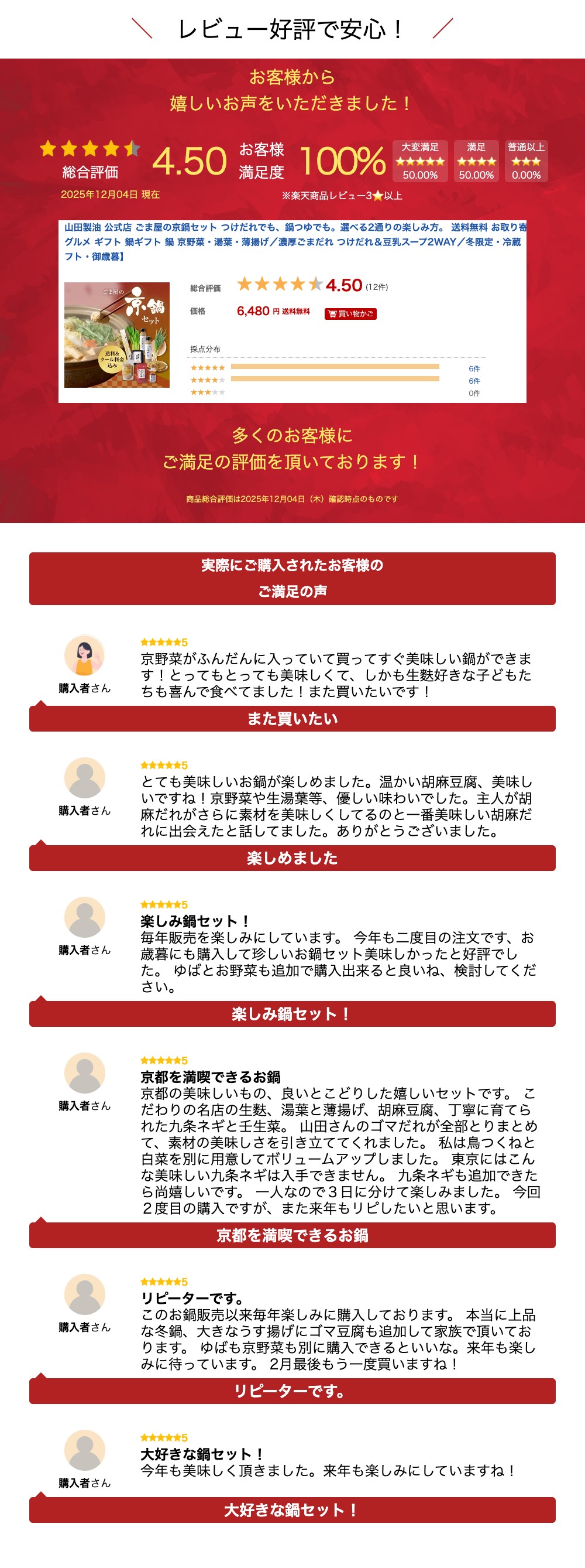 京都の冬素材と、香ばしいごま製品を詰め合わせた、冬季限定の贅沢鍋セット。 ごまだれは「つけても」「割っても」2通りで楽しめます。 年末年始のご自宅用にも、贈り物にもおすすめ。 セットに含まれる ・「ごま豆腐」 ・「ごまだれ(白)」 ・「【賀茂とうふ近喜】うす揚げ(大)」 は追加注文もしていただけます。 ■ 商品代金 6,000円 (送料・消費税・クール代込) 3〜4人前 受付 火〜木曜→出荷 翌週火曜 受付 金〜月曜→出荷 翌週金曜 年内最終受付:12月18日(木) 年内最終出荷:12月23日(火) ■ 発送日は火曜日か金曜日となります。 ※天候などによりセットの内容が一部変更になる場合がございます。ご了承くださいませ。※賞味期限:小巻ゆば 3日 胡麻豆腐 3日 お揚げ 5日(出荷日を含む)※送料・クール代無料。 《セット内容とおすすめポイント》 ◆京都桂:巣林庵さんの小巻ゆば×2本 京都の老舗が生むとろける美味しさ 濃厚な大豆の旨味が特徴。厳選した国産大豆と、西山・愛宕山を源とする水源の地下50mから汲み上げられた天然水を使用し湯葉汁の炊き上げから仕上げまで一貫して職人が手作りした一品。 ◆京都:賀茂とうふ近喜さんのうす揚げ(大)×1枚 大豆の旨味がしっかり味わえる 外側はカリっとして香ばしく中はふっくら大豆の旨みが特徴。一枚一枚丁寧に手揚げされた賀茂とうふ近喜の自慢の一品。 ◆日吉町胡麻:北井さんの壬生菜約200g みずみずしい、シャキシャキ食感 柔らかくほんのりとした甘味が特徴の壬生菜。減農薬で丁寧に育てられた京野菜。胡麻工場の近くで壬生菜といえば北井さんというぐらいベテランの農家さんです。 ※収穫状況、天候などにより、野菜の種類・生産者が変わる場合があります。 ◆日吉町:京八(きょうや)さんの九条ねぎ約100g 口当たり柔らか、甘みが美味しい 甘みが強く、風味が良いく柔らかい九条ネギ。胡麻工場の近くで九条ネギのブランドを守り全国においしいネギを届けてられます。 ※収穫状況、天候などにより、野菜の種類・生産者が変わる場合があります。 ◆京都桂:山田製油のごまだれ(白)165g×2本 胡麻屋ならではの濃厚ごまだれ. 濃厚でしっかりした胡麻の味が特徴のごまねりねりをたっぷり使用。添加物不使用で、ごまの風味と厳選した調味料のおいしさが味わえます。つけだれでも、豆乳などで割って鍋つゆでも、お好みで楽しめます。鍋つゆでお召し上がりの際は、ごまだれ1本に豆乳500ccを加えて温めてください。 ◆京都桂:山田製油の金ごま油60g×1本 鍋の仕上げにひと回しすれば、香りがふわっと立ち上ります。ごまだれに少量加えても、風味がぐっと引き立ちます。 ◆京都桂:山田製油の胡麻豆腐130g×1パック シンプルな素材で丁寧に手づくり。温めると口の中でトロ〜リとろけて、とても美味! ◆京都桂:山田製油の京のごまらぁ油の粉20g×1袋 鍋のつけだれにふとふりで、ピリッとした辛味と香ばしさが加わります。辛い物がお好きな方におすすめの"味変"アイテムです。 ◆京都桂:山田製油のalto motto sesame(プレーン)80g×1袋 万能ごまペースト。お鍋に溶かしてコク出しに、またはつけだれに加えて味わいを深めても◎ 商品詳細 商品名 ごま屋の京鍋セット|つけだれでも、鍋つゆでも。選べる2通りの楽しみ方。 賞味期限 小巻ゆば 3日 胡麻豆腐 3日 お揚げ 5日(出荷日を含む) 内容量 京都桂:巣林庵の小巻ゆば×2本 京都:賀茂とうふ近喜のうす揚げ(大)×1枚 日吉町胡麻:北井さんの壬生菜約200g 日吉町:京八(きょうや)さんの九条ねぎ約100g 京都桂:山田製油のごまだれ(白)165g×2本 京都桂:山田製油の金ごま油60g×1本 京都桂:山田製油の胡麻豆腐130g×1パック 京都桂:山田製油の京のごまらぁ油の粉20g×1袋 京都桂:山田製油のalto motto sesame(プレーン)80g×1袋 保存 高温多湿を避け常温保存 アレルギー <小巻ゆば>大豆 <うす揚げ>大豆(※同じ製造ラインで、ごま・山芋・小麦を含む製品を製造しています。) <ごまだれ>小麦・大豆・ゴマ <金ごま油>ゴマ <胡麻豆腐>ゴマ <京のごまらぁ油の粉>ゴマ <alto motto sesame(プレーン)>ゴマ 販売元 株式会社山田製油 〒615-8075 京都府京都市西京区桂巽町4 関連商品山田製油 京都 へんこ ギフト「鴨川」無添加 工場直送 公式店 ギフト...山田製油 京都 へんこ ギフト「香り一番」 無添加 工場直送 公式店 ...ごまだれ(白)165g《京都へんこ山田製油》無添加 万能 ごまだれ 手...7,000円5,400円691円山田製油 京都 へんこ ギフト「嵯峨野(さがの)」 無添加 工場直送 ...山田製油 京都 へんこ ギフト「楽天ランキングセレクション」 無添加 ...山田製油「俺の油」110g《京都へんこ山田製油》ゴマ油 ごま油 胡麻油...5,800円5,300円1,512円関連ワード: お歳暮 ギフト 出産祝い 還暦祝い お返し 期間限定 生麩 湯葉 油揚げ 胡麻豆腐 九条ねぎ お歳暮 御年賀 壬生菜 国産 よもぎ 鍋ギフト 山田製油 京都 山田製油 国産 ごまだれ 京野菜 豆腐 プチ ギフト 麩 九条ネギ 山田 製油 ゆば 生麩 もちもち 山田 製油 ごま 山田 製油 ギフト 山田 ごま油 ゆば 鍋セット お歳暮 湯葉 お歳暮 冬ギフト 京