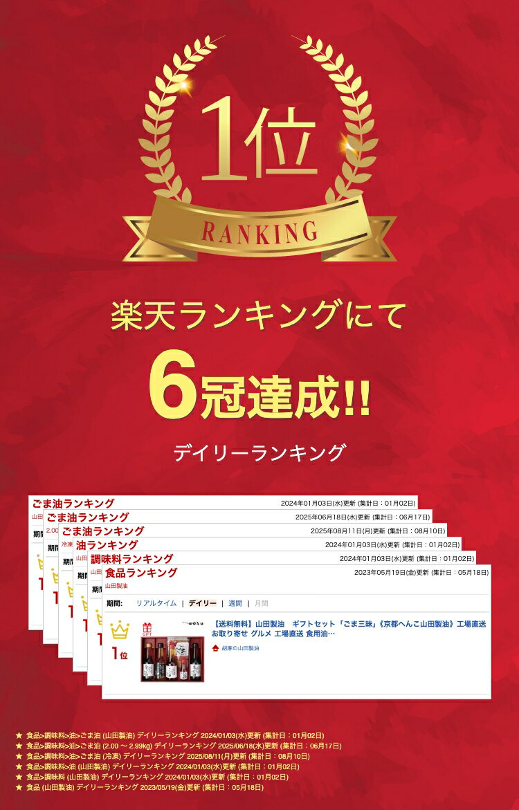 ごまで「健康」の贈り物を。 たっぷりキッチンサイズのごま油が大集合! 4種のごま油に、炒りごま・すりごま・練りごま、人気商品のごまらぁ油が入った お料理好きの方にピッタリのギフトセットです。 [セット内容] ごま油 275g×1 金ごま油 275g×1 黒ごま油 275g×1 エキストラバージンごま油 275g×1 ごまらぁ油 60g×1 ねりごま[白]150g×1 すりごま[白]45g×1 炒りごま[金]35g×1 ギフト箱 [製造販売元] 株式会社山田製油 〒615-8075 京都府京都市西京区桂巽町4 ※ご注文前に必ずお読み下さい※ 簡易包装を開始致しました。エコへのご協力をお願い致します。 帯状の包装紙を巻いた状態でのご用意となります。簡易包装を希望されない場合は、従来通りの全包装も対応しております。 ★ギフト商品の「お買い物かごに入れる」をクリックする前に、かごボタン直ぐ上の「包装について」の選択肢から「エコ簡易包装可」または「エコ簡易包装 不可」を選択下さい。 手間隙かけた職人の味。へんこ山田の美味しいギフト。 【季節の贈り物】 バレンタイン、義理チョコ、友チョコ、初節句 【結婚式の贈り物】 引出物、プチギフト、結婚内祝い 【内祝いやお返しなどの品】 結婚内祝い、入学内祝い、出産内祝い、発表会お返し、快気内祝い、 法事のお返し、新築内祝い、開店内祝い 【お祝いや祝儀などの品】 出産祝い、新築祝い、結婚祝い、開店祝い、入学祝い、還暦祝い、 誕生日祝い、古希祝い、七五三、喜寿祝い、昇進祝い、米寿祝い 【特別な贈り物】 お年賀、敬老の日、御中元、バレンタイン、御歳暮、ホワイトデー、 母の日、引越しご挨拶、父の日、御見舞い 【記念品など】 記念品、参加賞、粗品、景品、法人ギフト、販促ノベルティ 【仏事法要】 法事、法要、仏事、弔事、志、粗供養、満中陰志、御供え、 御供物、お供え、香典返し、法事のお返し ※ラッピング、のし対応いたします。 ※オリジナルメッセージのカード(無地ハガキサイズ)をお入れできます。 関連商品山田製油 京都 へんこ ギフト「鴨川」無添加 工場直送 公式店 ギフト...山田製油 京都 へんこ ギフト「ごまの味 七変化」無添加 工場直送 公...山田製油 京都 へんこ ギフト「朱雀(すざく)」 無添加 工場直送 ...7,000円5,000円4,800円山田製油 京都 無添加 ごま油 275g×12本入《京都へんこ山田製油...【新商品】胡麻職人のごま油(1号)105g 山田製油 ごま油 濃口ごま...山田製油 公式店 京都 ごま油 916g 工場直送 無添加 職人が搾...11,664円1,080円2,484円山田製油 手付き 金ごま油60g 京都へんこ ごま油 胡麻油 ゴマ油 ...山田製油「俺の油」110g《京都へんこ山田製油》ゴマ油 ごま油 胡麻油...山田製油 黒ごま油 60g【お試しにちょうどいいミニサイズ】《京都へん...594円1,512円594円山田製油 公式店 エキストラバージンごま油 275g 工場直送 無添加...山田製油 京都 無添加 エキストラバージンごま油 916g 高級 胡麻...山田製油 エキストラバージンごま油140g 生搾り 生搾りごま油 太白...1,188円2,592円691円
