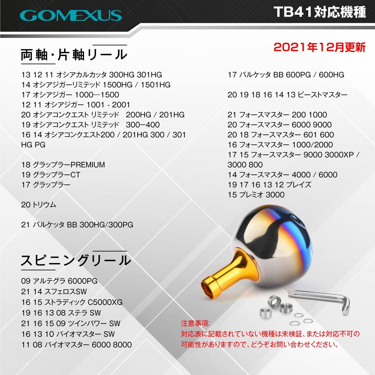 サイズ 直径41mm 重さ:19g 対応機種 適合機種は以下の説明限りではありませんので、もし適合についてご不明な場合はお気軽にお問い合わせください。 TypeB対応機種: 18 ストラディック SW 4000HG 4000XG 5000PG 5000XG 15 09 ツインパワー SW 4000PG 4000XG 5000HG 5000XG 6000HG 6000XG 6000PG 8000HG 8000PG 10000PG 12000HG 12000XG 14000XG 13 08 ステラ SW 4000PG 4000XG 5000HG 5000PG 5000XG 6000HG 6000PG 6000XG 8000HG 8000PG 10000PG 10000XG 14000XG 18000HG 20000PG 30000 16 13 10 08 バイオマスター SW SW 4000HG 4000XG 5000PG 5000XG 6000HG 6000PG 6000XG 8000HG 8000PG 10000HG 15 ブルズアイ 5050 5080 14 ブルズアイ 9100 9120 アルテグラ 6000PG 15 パワーエアロ プロサーフ 太糸 極太 標準 対応機種(ベイトとジギングと電動リール シマノ B): 19 プレイズ 12 フォースマスター 1000MKHD 12 フォースマスター 1000MKHD 11 フォースマスター 800MK 1000MK 16 ビーストマスター 3000XP 3000XS 14 ビーストマスター 6000 9000 17 バルケッタ BB 600HG 600PG 13 タリカ 20 25 17 ゲンプウXT 200PG 201PG 17 グラップラー 300HG 301HG 15 プレミオ 3000 13 カルカッタ 800F 801F 15 カイコン 2000T 3000T 4000T 14 オシアジガー リミテッド 1500HG 1501 16 オシアコンクエスト 300PG 301PG 15 オシアコンクエスト 300PG 301PG 14 オシアコンクエスト 200PG 201PG 13 オシアカルカッタ 300HG 301HG 11 SC小船 800 800XH 1000 1000XH 2000 2000XH 3000 3000XH 特徴・アフターサービス等 【チタン製パワー ハンドルノブ】 ★0.6mm壁薄中空構造のチタン製で、軽量に仕上がる一方、かなりの高強度を保証できます ★チタンの特有の低い熱伝導率で、冬は冷たくないし、夏は熱くないです ★ 掌側は丸い形状と加工し、指先側は緩やかな五角形でパワー系釣法では、 指が滑りにくく一日中巻いても疲れをかんじません。それに、力をしっかりと入れて魚とのバイトの主導権を握ります。 アフターサービス:24時間以内返信・60日以内無条件返品交換
