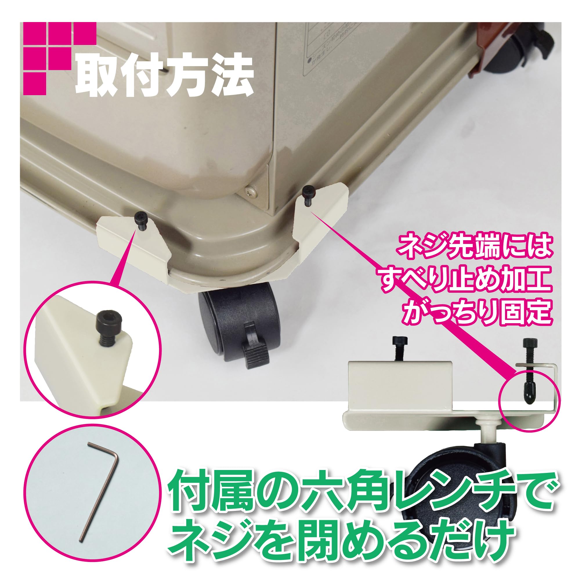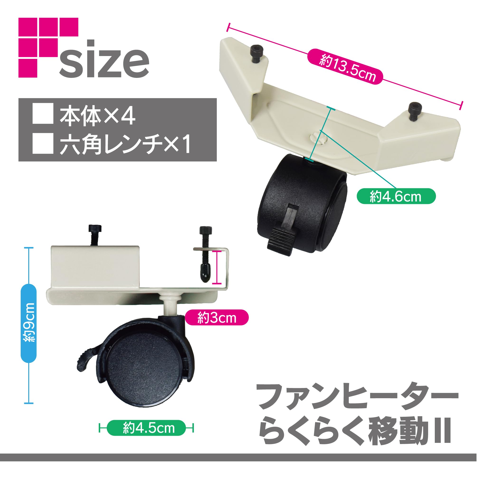 商品情報商品の説明【サイズ(約)】幅13.5×奥行4.2×高さ9(突起部含む)cm 【耐荷重(約)】30kg 【セット内容】キャリー×4 六角レンチ×1 【材質】本体=スチール(粉体塗装)、キャスター部=ナイロン 【生産国】中国 ※石油ファンヒーター用 【重いファンヒーターの移動が楽に!】ご家庭のヒーターの底受けにつけるだけでファンヒーターを持ち上げず、軽い力でラクラク移動できます。掃除の際に大活躍間違いなしです。 【スムーズな動きのキャスター&ピタッと止まるストッパー付き】滑らかに動く頑丈なキャスターで前後左右楽に移動可能。キャスターそれぞれにストッパーがついているので、点火時はしっかりと固定でき安心しておつかいいただけます 。 【4隅取り付けタイプで幅広い機種に対応】底受けの四隅に取り付けるため、台車タイプと違い様々なサイズのヒーターに取り付け可能。六角レンチが付属し、届いたらすぐに設置ができます。※定期的にネジの緩みがないか確認してください。 【こんなシーンに】掃除の時はもちろんのこと、模様替え、オフシーズンの片付け、別の部屋でヒーターを使用したい時など移動時にとても役立ちます。※移動の際は必ず消火確認を行い、電源プラグを抜いてください。主な仕様 【サイズ(約)】幅13.5×奥行4.2×高さ9(突起部含む)cm 【耐荷重(約)】30kg 【セット内容】キャリー×4 六角レンチ×1 【材質】本体=スチール(粉体塗装)、キャスター部=ナイロン 【生産国】中国 ※石油ファンヒーター用br【重いファンヒーターの移動が楽に!】ご家庭のヒーターの底受けにつけるだけでファンヒーターを持ち上げず、軽い力でラクラク移動できます。掃除の際に大活躍間違いなしです。br【スムーズな動きのキャスター&ピタッと止まるストッパー付き】滑らかに動く頑丈なキャスターで前後左右楽に移動可能。キャスターそれぞれにストッパーがついているので、点火時はしっかりと固定でき安心しておつかいいただけます。br【4隅取り付けタイプで幅広い機種に対応】底受けの四隅に取り付けるため、台車タイプと違い様々なサイズのヒーターに取り付け可能。六角レンチが付属し、届いたらすぐに設置ができます。※定期的にネジの緩みがないか確認してください。br【こんなシーンに】掃除の時はもちろんのこと、模様替え、オフシーズンの片付け、別の部屋でヒーターを使用したい時など移動時にとても役立ちます。※移動の際は必ず消火確認を行い、電源プラグを抜いてください。