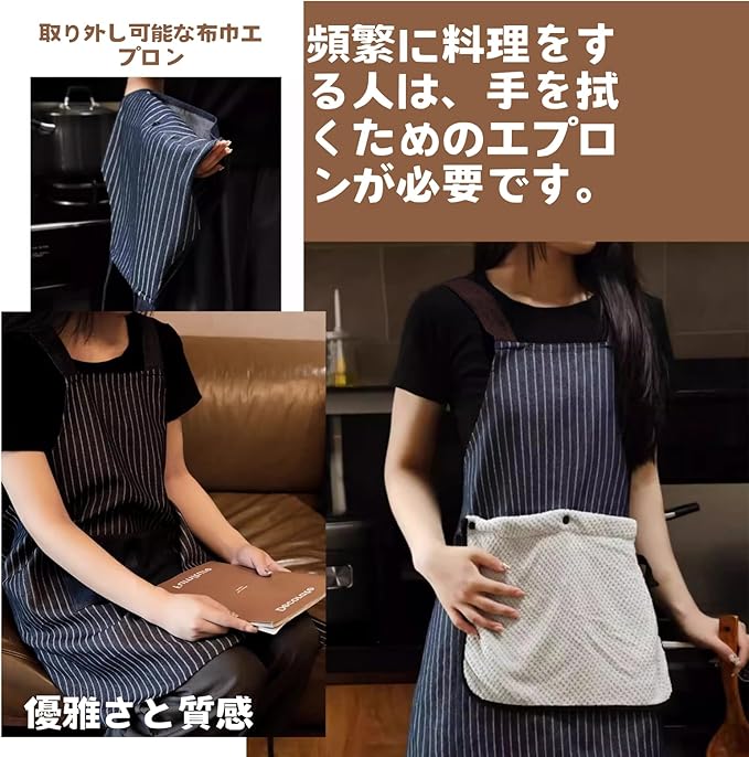 商品情報素材/材質アクリル100%サイズ/寸法フリーサイズ■サイズ長さ:約70cm幅:約68cm※手作業による採寸のため、1〜3cmの誤差が生じる場合がございます。その他商品説明【いろいろな状况で大活躍】取り外し可能なクロスが付いたこのエプロンは、料理や家事中に手が汚れたときや、手を洗った後に拭きたいときなど、さまざまな場面で大活躍します。手を乾かすために決まった場所に移動する必要がないため、時間を節約でき、手を洗った後に床が濡れることもありません。洗濯後に簡単に乾かせるように、クロスが吊り下げループ付き。【シンプルかつスタイリッシュ】シンプルなデザイン、結ぶ必要がなく、着脱が簡単、幅広のショルダーストラップで肩への負担を軽減、シンプルなストライプ柄がファッション要素を加え。男女問わず着用可能です。【大容量ポケット】エプロンの前側には大容量のポケットがあり、荷物の取り出しに便利な十分な収納スペースを備えています。【耐久性のあるデニム】このエプロンは程よい厚みのデニム生地で作られています。汚れに強く、丈夫で、忙しい日々でも手間なく使えます。【幅広い使用】キッチンや家事だけでなく、料理教室やガーデニング、絵画や陶芸など様々なシーンで活躍します。日常使いだけでなく、プロの厨房などで頻繁に使用するシーンにも最適です。注意モニター発色の具合により色合いが異なる場合がございます。\人気商品 /エプロン クロス付き 取り外す 丸洗 おしゃれ ワークエプロン かぶるだけ かぶり 大きいサイズ オシャレ レディース メンズ 大人 北欧 黒 無地 ワンピース クロス かわいい かっこいい 業務用 ガーデニング 軽量 X型 作業用 介護 ロング 男女兼用 送料無料 作業用エプロン グリーン Xショルダー 介護士 作業 男女兼用 女性用 男性用 春 夏 秋 冬 ポケット 母の日 ギフト プレゼント 学生 男性 女性 ブランド 5