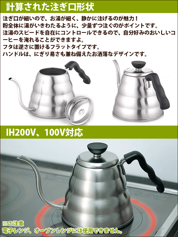 商品情報 注ぎやすい細口コーヒードリップケットル ●注ぎ口の細いドリップケトルはお湯の量やスピードがコントロールしやすく、おいしいコーヒー淹れるのに役立ちます。●全ての熱源に対応。(IH200V・100V、ガスコンロ、エンクロヒータ、ラジエントヒータ、ハロゲンヒータ、シーズヒータ) ●フタは逆さに置けるフラットツマミです。 サイズ(約) 幅274×奥行144×高さ147mm口径:77mm実用容量:800ml(満水容量:1200ml) 材質 本体・フタ:ステンレスフタツマミ・取っ手:フェノール樹脂 配送区分 【同梱OK】 備考 生産地/日本 IH100V・200V対応、直火対応 ※電子レンジ・オーブンレンジではご利用いただけません こんな方におすすめ 珈琲ポット コーヒー 珈琲 ホットコーヒー ホットコーヒー カフェオレ ミルク ドリップポット 卓上 ケトル ケットル バリスタ サンフランシスコ V60ドリッパー アメリカ ハリオ式 ハリオグラス ドリップ用 細口やかん コーヒー器具 ネルドリップ ガス火 IH100 IH200 対応コーヒーメーカー セット コーヒーメーカー コーヒーサーバー ドリップ ドリッパー 珈琲 耐熱ガラス 耐熱グラス ハリオグラス HARIO ランキング 清涼特集 として メーカー希望小売価格はメーカーカタログに基づいて掲載していますよく一緒に購入されている商品HARIO ハリオ V60 透過 コーヒードリ473円HARIO ハリオ V60 コーヒーサーバー 891円HARIO ハリオ New V60 ドリップイ990円\レビューで1000円クーポン!/ HARIO2,640円関連商品はこちら\レビューで1000円クーポン!/ HARIO3,146円\レビューで1000円クーポン!/ HARIO6,391円\レビューで1000円クーポン!/ HARIO5,720円\レビューで1000円クーポン!/ V60 メ4,400円\レビューで1000円クーポン!/ HARIO2,376円\レビューで1000円クーポン!/ V60 7,150円\レビューで1000円クーポン!/ V60 8,250円\レビューで1000円クーポン!/ V60ドリ4,180円