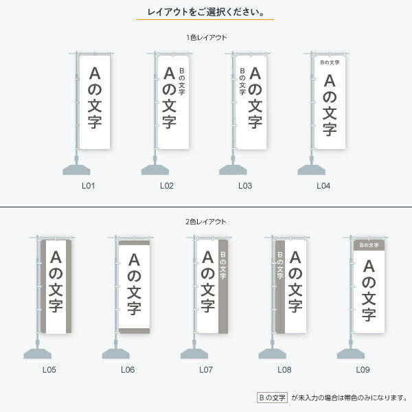 どうやって注文するかピン!とこない。いえいえカンタンです。こちらの商品は10枚 (数量10)から購入可能で、追加は1単位 (数量1につき1枚)で販売しております。すっごく簡単な特注のぼり旗。オリジナルののぼり旗が素材から選ぶだけの簡単操作で、悩まずにご注文いただけるようになりました!出来上がったものから選ぶだけだから、お打ち合わせにお手間をおかけしません!イメージを見ながら選べる。伝えたい文言に合うレイアウトと色、もじだけをテンプレートから選んでオリジナルのぼり旗が完成!完成図がイメージし易い「シンプルな文字のみ」のぼり旗デザイン書体、レイアウトと色のテンプレートをご用意しましたので、「オリジナルののぼり旗は初めて!」という方や、「オリジナルの文言を強調したい」という方でも、簡単にのぼり旗を作ることができます。ご注文時のレイアウト、カラー、書体は途中変更出来ませんが、更に細かく指定したい! レイアウトやカラーを見比べたい!という場合は「デザインアレンジ」を追加でご注文ください。