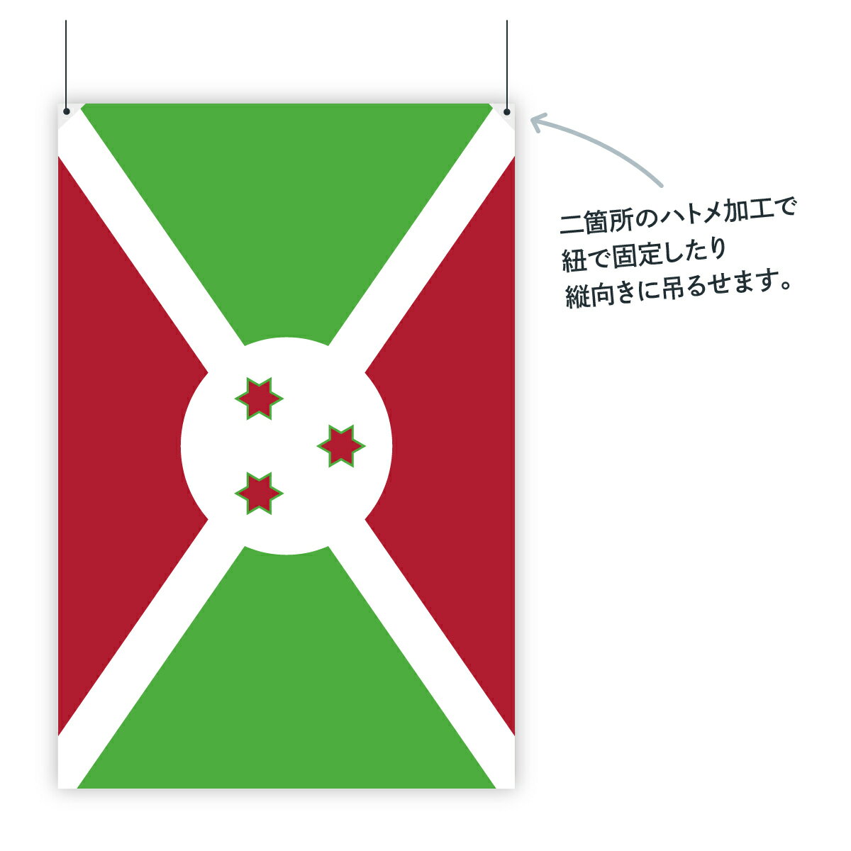 はためきやすさを追求したとても軽い生地の国旗です。風の強い中でもポールに負担がかかりにくく、手持ちでも風で煽られにくい、扱いやすい国旗です。ハトメの位置を変えられるから横2箇所でポール使用。上2箇所で屋内で。4箇所で天井に吊るしたりも。ブルンジ共和国 国旗 W75cm H50cm印刷 : フルカラーダイレクト印刷またはシルク印刷生地 : ポンジサイズ : ブルンジ共和国 国旗 W75cm H50cm裁断面処理 : ほつれ防止の三巻縫製固定方法 : 横ハトメ2箇所、上ハトメ2箇所、または四方4箇所付属品 ハトメ2箇所 45cm紐2本 ハトメ4箇所 45cm紐4本国旗アイテムもっとみる
