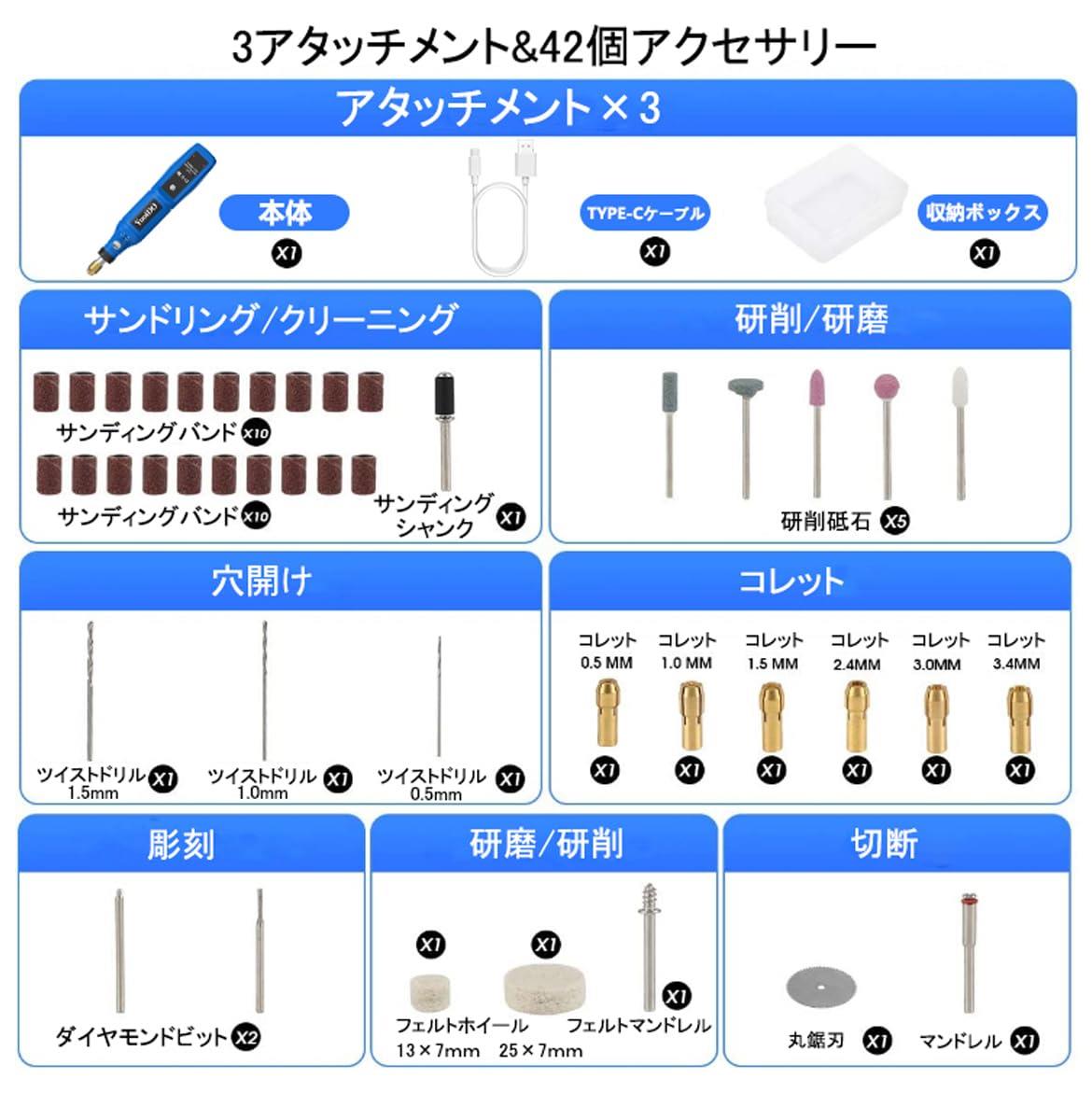 【TYPE-C充電式・コードレス】リューター充電式のモデルはコードレス式で、作業中にコードに邪魔される心配しません。リチウ ム電池を採用して、TYPE-C充電式で接続して充電できます。無負荷で1時間くらい作業し続けられます。 ガラス彫刻や金属研磨・穴あけ・つや出し・模型工作などに対応できる、DIYや趣味など幅広い場所で使い勝手よく楽々。【16000RPM高速回転&低騒音】本りゅーたーは16,000回転/分まで回転数を作業内容や素材に合わせて達せられる。最適な回転数で彫刻/穴あけ/研磨/切断/切削/汚れ落としなどの様々な作業を楽々にします。またペンみたいなサイズで、握りやすくて快適さが感じられます。自宅でリューターを使用する場合には、騒音としては少ないですし、自宅で静音性に優れたものとして安心的に使用することができます。【42PCS付属品&多種多様な用途】この電動リュータービット42個のアクセサリーが付属しており、サンディング、カット、彫刻、研磨、穴あけ、ネイルアートなど、さまざまな家庭用プロジェクトや手作業の作業に使用できます。ペン 型ミニリューターは先端に様々なビットを取り付けて、回転させることで色々な用途に使えるりゅーたーです。彫刻や彫版・研磨・研削・艶出しや汚れ落とし・研きなどの用途でご利用いただけます。小型や軽作業に向いているため、多くのホビーユーザーに重宝されております。【高品質・軽量なミニリューター】りゅーたーTYPE-C充電式ミニルーターコードレスで強力なパワーがあります。DIYやホームリフォームの作業に最適です。80gの軽量でコードレスなので家だけでなく、屋外でも作業できます。軽いので細部の彫刻には特に最適、工作やアクセサリー作りなどに便利です。【豊富なアクセサリー】豊かなビットを付属して、1×ミニルーター、1×アクセサリーケース、42×アクセサリー、1×TYPE-C充電ケーブル、1×取扱説明書。