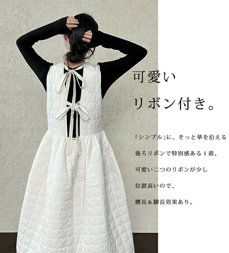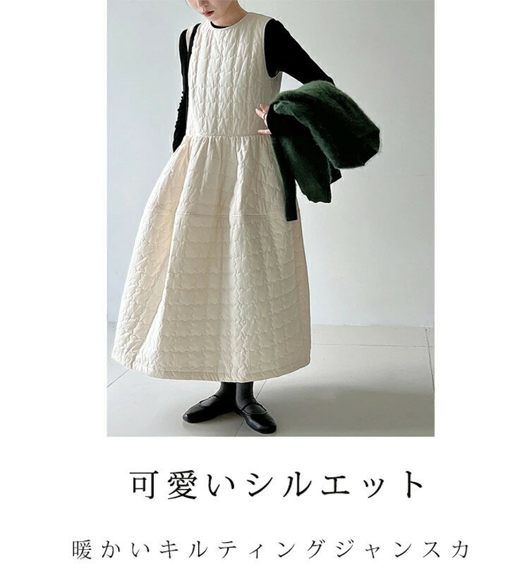 キルティング ワンピース 秋冬 きれいめ ロングワンピース ノースリーブ バックリボン ワンピース ロング丈 Aライン フレア 綿100% 中綿ワンピース キルト ジャンパースカート