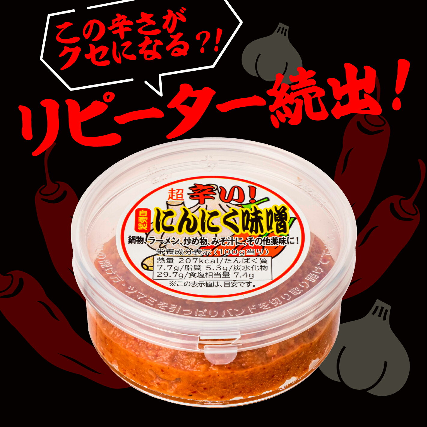 にんにくたっぷり、辛さびっくりの自家製「にんにく味噌」!! ごはんにラーメン、豆腐に野菜、炒めもの、そして鍋にと用途が広がります。 ニンニクと辛味噌の絶妙のバランスをご賞味下さい。 商品詳細 商品番号 1006 品 名 にんにく味噌(100g) 内容量 100g 賞味期限 製造日より常温で150日 ●お支払い方法について ●送料について ●お困りの際には…