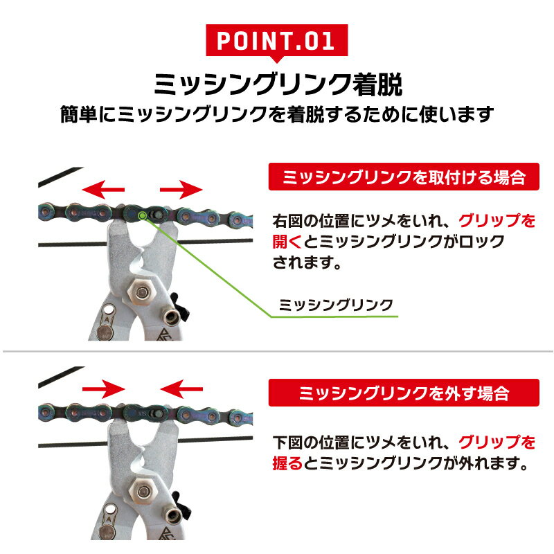 メーカー希望小売価格はメーカーサイトに基づいて掲載しています GORIX ゴリックス 5機能マルチ ミッシングリンク工具 ワイヤーカット GT-188 自転車工具 一つの工具で5機能もの工具として使える、優れた自転車用工具です。 1.ミッシングリンク工具 2.ミッシングリンクホールド 3.ワイヤーカット 4.エンドキャップ締め 5.ワイヤー切断面の穴開き チェーン工具としてはミッシングリンク回りのメンテナンスに。 ワイヤー回りも切断から穴開きなど必ず使う機能が使えます。 ロードバイクやマウンテンバイク、クロスバイクやママチャリまで 自転車全般の整備作業に。 内容 サイズ:全長18cm 《ご注意》 ・商品は入荷によりキズがある場合があります。 保証対象外になりますのでご了承お願い致します。 ・ディスプレイ環境により実物と色が異なる場合が有ります。 ・入荷時期により予告無く一部仕様変更する場合が有ります。一つの工具で5機能もの工具として使える、優れた自転車用工具です。 チェーン工具としてはミッシングリンク回りのメンテナンスに。 ミッシングリンクの着脱に。 ワイヤー回りも切断から穴開きなど必ず使う機能が使えます。 ロードバイクやマウンテンバイク、クロスバイクやママチャリまで 自転車全般の整備作業に。 1.ミッシングリンク工具 2.ミッシングリンクホールド 3.ワイヤーカッター・アウターケーブルやインナーケーブルの切断 4.アウターケーブル・インナーケールブルのカシメ 5.アウターケーブルの穴潰れなどの整形 サイズ約全長18cm カラーオレンジ 《ご注意》 ・商品は入荷によりキズがある場合があります。 ・保証対象外になりますのでご了承お願い致します。 ・ディスプレイ環境により実物と色が異なる場合が有ります。 ・入荷時期により予告無く一部仕様変更する場合が有ります。