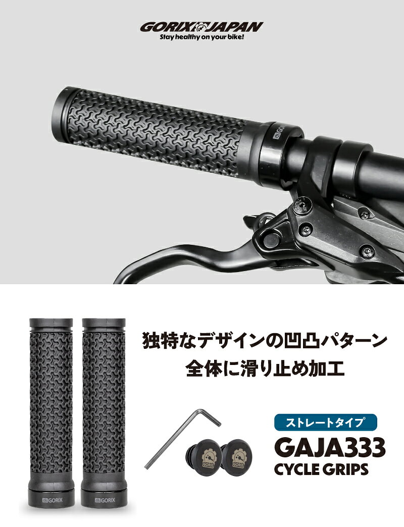 商品内容自転車グリップ、取り付け工具 材質TPR環境に優しいゴム, PP サイズ135/135mm 重量約110g/ペア 仕様丸グリップ、内側ロックオン 対応フィットハンドルバーの直径20-22.2mm 取付上の注意ロックオンのネジはグリップが動かないように確実に締めて下さい。 緩い場合はグリップが回ってしまい危険です。 エンドキャップが嵌りにくい場合はハンマーなどで叩くと嵌りますのでお試しください。 《ご注意》 ・【初期不良の場合】到着後3日以内にご連絡頂いた場合商品保証させて頂きます。 (3日以内にご連絡頂けない場合はご対応出来なくなります) ・商品は入荷によりキズがある場合があります。 その場合、保証対象外になりますのでご了承お願い致します。 ・ディスプレイ環境により実物と色が異なる場合が有ります。 ・入荷時期により予告無く一部仕様変更する場合が有ります。GORIX GAJA333 [スッキリとした見た目、グリップ交換に!] クロスバイクやマウンテンバイク、ミニベロ、小径車などのフラットハンドルのグリップ交換に最適です。 ストレートタイプで表面の特長的な凸凹パターンはグリップ力を高めます。 自転車のグリップを交換する事で自転車での快適性がアップしカスタマイズとしても楽しんでいただけます。 特徴 ●ストレートタイプの丸グリップ ●操作性とダイレクト感を感じられる癖のない自転車グリップ ●スッキリした見た目を好むライダーにおすすめ ●独特なデザインの滑り止め用の凹凸パターン ●雨の日や汗でも滑りにくく ●主流の内側のみロックオン ●内部に芯があり滑りやすく装着しやすい ●耐久性と耐摩耗性、耐滑り性、耐衝撃性に優れているTPR素材 ●クロスバイクやmtbなどフラットハンドルのグリップ交換に 【丸グリップ】 オーソドックスな丸形グリップは身近で馴染のある癖のない筒状形状。 手全体でしっかり握れる事ができるのでダイレクトで細かい操作性は抜群です。 エルゴタイプが苦手な方にもおすすめです。 【グリップ力】 グリップ表面には凸凹パターンを施し汗や雨で濡れても滑りにくくしグリップ力を向上。 独特の凸凹パターンでデザイン性もあり 【ロックオンタイプ(ネジ固定)】 交換作業の短縮や角度調整の微調整が素早くできます。 ※ネジは確実に締めて下さい 商品内容自転車グリップ、取り付け工具 材質TPR環境に優しいゴム, PP サイズ135/135mm 重量約110g/ペア 仕様丸グリップ、内側ロックオン 対応フィットハンドルバーの直径20-22.2mm 取付上の注意ロックオンのネジはグリップが動かないように確実に締めて下さい。 緩い場合はグリップが回ってしまい危険です。 エンドキャップが嵌りにくい場合はハンマーなどで叩くと嵌りますのでお試しください。 《ご注意》 ・【初期不良の場合】到着後3日以内にご連絡頂いた場合商品保証させて頂きます。 (3日以内にご連絡頂けない場合はご対応出来なくなります) ・商品は入荷によりキズがある場合があります。 その場合、保証対象外になりますのでご了承お願い致します。 ・ディスプレイ環境により実物と色が異なる場合が有ります。 ・入荷時期により予告無く一部仕様変更する場合が有ります。 -GORIX-ゴリックス- -Stay healthy on your bike!- "自転車、スポーツを通して健康で楽しい豊かな生活を!" GORIXでは初心者の方からビギナーの方まで気軽に自転車をカスタマイズを楽しめるようなアイディア商品をラインナップしています。