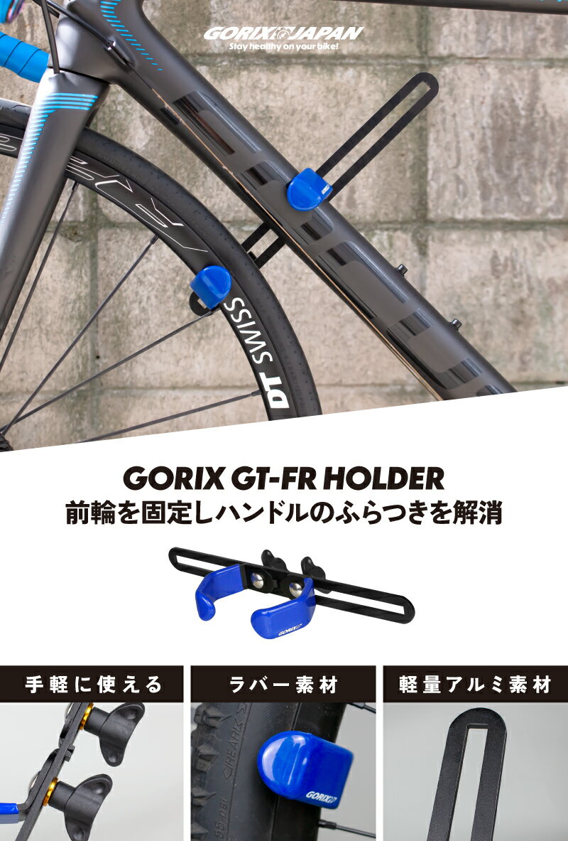 商品内容自転車前輪ホルダー サイズ長さ 322mm × 高さ 100mm フック開口範囲9.8cm - 31cm 重量約210g 材質6061アルミニウム合金 + ラバー 対応車種ロードバイク、クロスバイク、マウンテンバイク(MTB)他 カラーブルー 使用上の注意・ナットをしっかり締めて使用してください ・開口範囲(9.8〜31cm)外の車体には使用できません ・カーボン車体は過度な締め付けに注意 ・走行中は必ず取り外してください 《ご注意》 ・商品は入荷時の状況により傷がある場合があり、その場合は保証対象外となりますのでご了承ください。 ・ディスプレイ環境により実物と色が異なる場合が有ります。 ・生産時期や仕様改善により、デザインが多少異なる場合がございます。あらかじめご了承ください。 《キャンセルについて》 ご注文後のお客様都合によるキャンセル・変更等できませんのでご了承ください。GORIX GT-FR HOLDER 自転車前輪固定ホルダー 「“ハンドル、タイヤのふらふら解消”」 ハンドルのふらつきを解消し、自転車の保管やメンテナンス時の安定感を向上させる前輪固定ホルダー。 アルミ合金製の軽量・高強度設計で、工具不要の簡単取り付け。最大31cmまで対応する可動式フックで、ロードからMTBまで幅広い車種に対応。 接地面はラバー加工でフレームやホイールを傷つけず、洗車時やイベント展示でも大活躍。 前輪とフレームをしっかり固定することで、転倒リスクを低減し、安全な作業と美しい保管をサポートします。 特徴 ●ハンドルのふらつきをロックして安全性アップ ●軽量かつ頑丈な6061アルミ合金を採用 ●工具不要で簡単に取り付け可能 ●可動範囲最大31cmで幅広い車種に対応 ●ラバー素材でフレームやホイールを傷から保護 【ハンドルが固定され安定感アップ】 洗車や整備時、展示スタンド使用時などに前輪のふらつきを防止し、転倒リスクを軽減。 【高強度×軽量のアルミ合金製】 6061アルミニウム合金採用で、鉄製より軽量かつ頑丈。毎日の使用にも耐えるタフな設計。 【工具不要の簡単装着】 取り付けはフックをかけるだけ。誰でも手軽に使え、作業時間も短縮。 【幅広い互換性】 可動式フックで9.8-31cmの開口範囲に対応。ロードバイクからMTB、クロスバイクまでカバー。 【車体を傷つけないラバー構造】 接触部には柔らかいラバー素材を使用し、フレームやホイールの塗装面をしっかり保護。 【ロング設計で安定感抜群】 全長322mmの設計で、ホイール間隔の広い車体にも安定対応。29インチMTBにも安心。 【ホイール保護にも効果】 横転によるホイールの曲がりを防ぎ、スポークやリムのダメージも軽減。 商品内容自転車前輪ホルダー サイズ長さ 322mm × 高さ 100mm フック開口範囲9.8cm - 31cm 重量約210g 材質6061アルミニウム合金 + ラバー 対応車種ロードバイク、クロスバイク、マウンテンバイク(MTB)他 カラーブルー 使用上の注意・ナットをしっかり締めて使用してください ・開口範囲(9.8〜31cm)外の車体には使用できません ・カーボン車体は過度な締め付けに注意 ・走行中は必ず取り外してください 《ご注意》 ・商品は入荷時の状況により傷がある場合があり、その場合は保証対象外となりますのでご了承ください。 ・ディスプレイ環境により実物と色が異なる場合が有ります。 ・生産時期や仕様改善により、デザインが多少異なる場合がございます。あらかじめご了承ください。 《キャンセルについて》 ご注文後のお客様都合によるキャンセル・変更等できませんのでご了承ください。 [関連キーワード] 自転車 前輪ホルダー 固定 前輪ロック固定 前輪固定 ストッパー とめる ハンドルロック ハンドル 真っ直ぐ ハンドルストッパー 転倒防止 前輪ロック 前輪ストッパー ロードバイク mtb マウンテンバイク クロスバイク 自転車前輪固定 ミニベロ 固定金具 回転 防止 -GORIX-ゴリックス- -Stay healthy on your bike!- "自転車、スポーツを通して健康で楽しい豊かな生活を!" GORIXでは初心者の方からビギナーの方まで気軽に自転車をカスタマイズを楽しめるようなアイディア商品をラインナップしています。