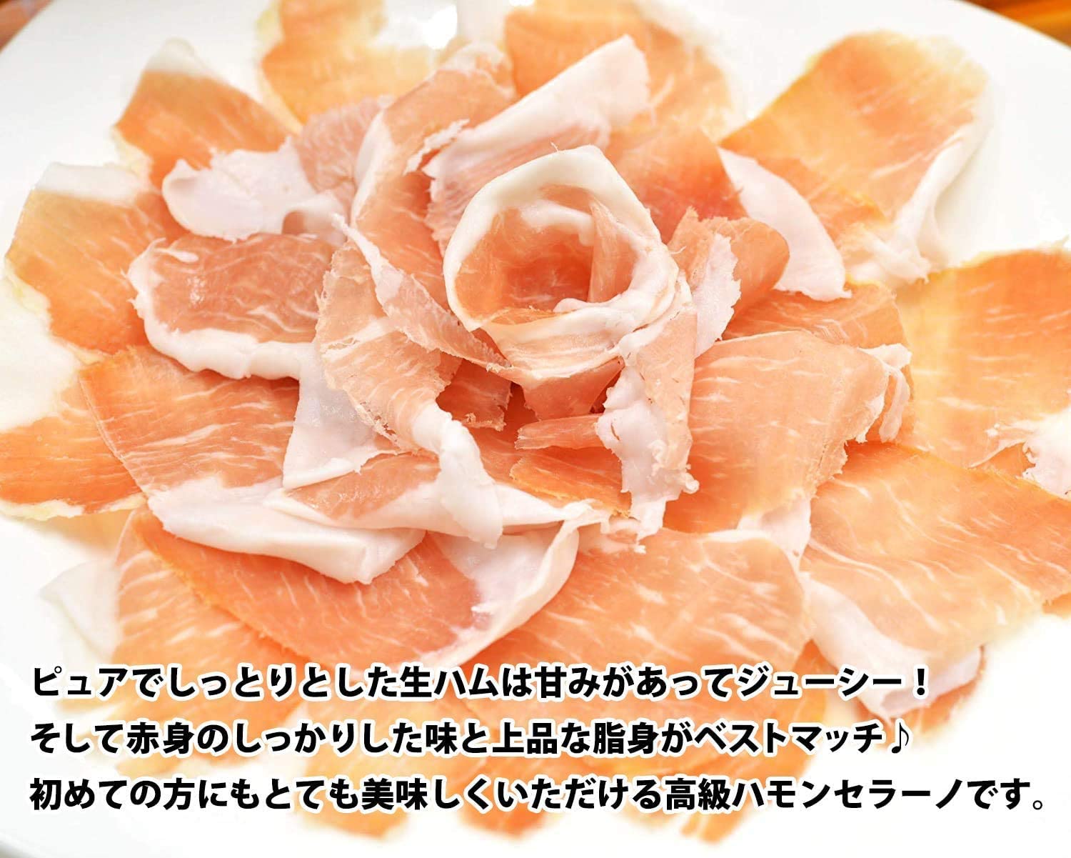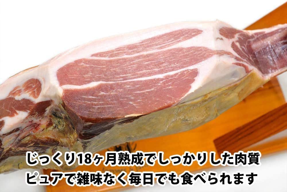【フビレス社のハモンセラーノは全て無添加、天然塩のみを使用し、皮付きのまま熟成させています。】 フビレス社の生ハムはイタリアのプロシュット同様に天然塩だけで塩漬け熟成させた無添加生ハムです。また、皮付きのまま熟成をさせることによって、脂は白く甘くピュアな味わいに仕上がり、熟成させた塩を使うことによって、プロシュートよりも塩分がマイルドなのも特徴で、多くのイタリア料理店でもご利用頂いております。 【フビレス社のボンレス生ハム(骨抜き生ハム)はノンプレス。生ハム本来の味を楽しめます。】 イタリアの圧縮をかけないプロシュート・レガート 同様に、骨を抜いた後プレスせずに整形した生ハムだからこそ、骨付き原木と同様の食感と風味を味わって頂けます。 他ブランドの形の整ったミニ原木は、プレスされることにより生ハムにストレスが掛かってしまいますが、グルメソムリエのミニ原木は、原木そのままの切り出しのため、生ハム本来の食感と味わいが違います。 《こちらの生ハムはイタリア等のプロシュートと同じように、天然塩だけの無添加、皮付きで熟成をかけたものになります》 ◆生ハムが初めての方にも馴染みやすい味わいとピュア食感が特徴のハモンセラーノ!十分な熟成をしている為クセも無く、毎日食べても飽きのこない美味しさです。高級生ハムの称号ともいうべきトレベレス地方フビレス村産ならではのコストパフォーマンスに優れた1本です!日本向けには特別に18ヶ月間じっくり熟成され輸入されております。 商品情報 【商品について】 商品名: ハモンセラーノ18ヶ月熟成・骨付生ハム原木 産地: スペイン トレベレス地方 フビレス村 原材料: 白豚の後脚・海塩(アリカンテ トレビエハ) 規格 : 骨付き原木 1本 (サイズ:約73×27×12cm 箱サイズ:76×32×16cm) 賞味期限: パッケージに記載(製造から2年) 【メモ】 生ハムは常温で保存できます。生ハムを開封するために必要なノウハウが同梱の「生ハム手引き書」に記載してあります。 その為にもお使いになる2,3日前に到着するようご手配下さい。 ※生ハム原木単品となります。(生ハム台はついておりません) ★常温便で送料無料でお届けいたします。 夏季は耐熱アルミシートで包んで急激な温度変化を防ぎながら発送致します。 ★冷蔵便ご希望の場合は有料になります。 佐川クール便になるため「クール便含む送料1100円」ご負担となります。備考欄に「クール便希望」とご記載下さい。 【商品の価格表示について】 こちらの商品は不定貫(1つ1つ重量差のある商品)になりますので、重量・価格は平均値を表示させていただいております。ご注文後に商品の正確な重量金額をメールにてご連絡させていただきます。 ★生ハムカバープレゼント 生ハム原木(単品)をご購入時に、ご希望者様には生ハムカバーを1枚をプレゼントさせて頂きます! 通気性が良く、生ハムの蒸れを防ぎながらちりや埃から守ることが出来ます。 滑らかな不織布で出来た「グルメソムリエオリジナル生ハムカバー(通常価格:580円)」 黒か赤のどちらかになります(※色はお任せください) ※ご希望の場合は必ずご購入時に、「ご注文の備考」欄に「生ハムカバー希望」とご記載ください。 『骨付き生ハム原木』のギフト包装につきまして 骨付き生ハム原木のギフト包装につきましては、写真のように箱の中に包装紙をかける形になります。ギフト及び熨斗ご希望の方は「ギフト包装(330円)」をお選びください。メッセージカードは無料サービスさせて頂きます。 ※「ギフト包装(330円)」をお選び頂かずに「のし」のみご希望の際にも包装代330円を頂戴いたします。【フビレス社の生ハムは全て無添加、天然塩のみを使用し、皮付きのまま熟成させています】 フビレス社の生ハムはイタリアのプロシュット同様に天然塩だけで塩漬け熟成させた無添加生ハムです。また、皮付きのまま熟成をさせることによって、脂は白く甘くピュアな味わいに仕上がり、熟成させた塩を使うことによって、プロシュートよりも塩分がマイルドなのも特徴です。 生ハムが初めての方にも馴染みやすい味わいとピュア食感が特徴のハモンセラーノ! 十分な熟成をしている為クセも無く、毎日食べても飽きのこない美味しさ♪ 高級生ハムの称号ともいうべきトレベレス産の中でもコストパフォーマンスに優れた1本です! 日本向けには特別に18ヶ月間じっくり熟成され輸入されております。 朝は、サンドイッチやアツアツのトーストにのせて美味しさ倍増!昼は、ミニサラダにのせてゴージャスランチ。(切り立てをラップにくるんで持ってくるのを忘れずに!!)脂の多めの部分は上等な生ベーコンのように卵料理と合わせて♪