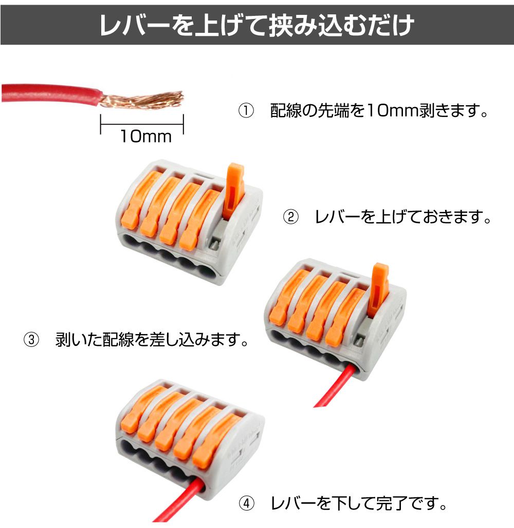 商品詳細 品番 AWD-T11AO 商品名 ワンタッチ配線接続コネクター T型接続(10個) 特徴 配線どうしを簡単に接続することができるコネクターです。 自動車をはじめ様々な接続、分岐などの配線作業で重宝します。 配線はレバーでの挟み込み式なので修正や再利用が簡単にできます。 入り数 10個 サイズ W26.2mm × L40.0mm × H14.7mm 適合配線 単線(銅): Φ0.65〜Φ2.0 IV7本より線: 0.08〜2.5(3.5※)mm2 より線: 0.08〜4.0※mm2 ※電線の種類や使用条件などにより使用できない場合があります。 注意事項 ※デザイン又は仕様の一部が予告なく変更となる場合がございますのでご了承ください。 ※ご使用の機器やモニターによって実際の商品と色味が異なる場合がございます。予めご了承ください。 キーワード コネクタ 分岐パーツ 分岐 部品 配線分岐コネクター 配線分岐 配線処理 配線コネクター 配線コード 配線 電装品 電装 電線 電源分岐 電源コード 電源ケーブル 電源 電気配線分岐作業 電気配線 電気工事 電気 端子不要 端子 接続端子 接続 常時電源 小型 処理 収納 車 自動車電装 自動車 工具不要 結線 軽自動車 簡単 加工 延長 ワンボックス ワンタッチ レバー ミニ バイク用品 バイク電装 バイク ハーネス パーツ トラック タップ ターミナル ソケット セット コネクター コネクタ コード ケーブル キャンピングカー キッチンカー かんたん カプラー カスタム 改造 カー用品 カー電装 お買い得 お得 オートバイ エレクトロタップ イルミ アクセサリー アース set LED DIY DC24V DC12V 24V 12V 電装パーツ ドラレコ カーナビ ETC USB充電 モニター カーオーディオ イルミネーション 【メール便ご希望の場合は必ずご確認ください】 ■ご注文前にこちらからメール便の注意事項をよくご確認ください。 ■メール便(定形郵便)商品と同時に注文いただいた場合、配送方法にシステム上「宅配便」と 表示されますが、ネコポスにて発送されます。商品詳細 品番 AWD-T11AO 商品名 ワンタッチ配線接続コネクター T型接続(10個) 特徴 配線どうしを簡単に接続することができるコネクターです。 自動車をはじめ様々な接続、分岐などの配線作業で重宝します。 配線はレバーでの挟み込み式なので修正や再利用が簡単にできます。 入り数 10個 サイズ W26.2mm × L40.0mm × H14.7mm 適合配線 単線(銅): Φ0.65〜Φ2.0 IV7本より線: 0.08〜2.5(3.5※)mm2 より線: 0.08〜4.0※mm2 ※電線の種類や使用条件などにより使用できない場合があります。 注意事項 ※デザイン又は仕様の一部が予告なく変更となる場合がございますのでご了承ください。 ※ご使用の機器やモニターによって実際の商品と色味が異なる場合がございます。予めご了承ください。