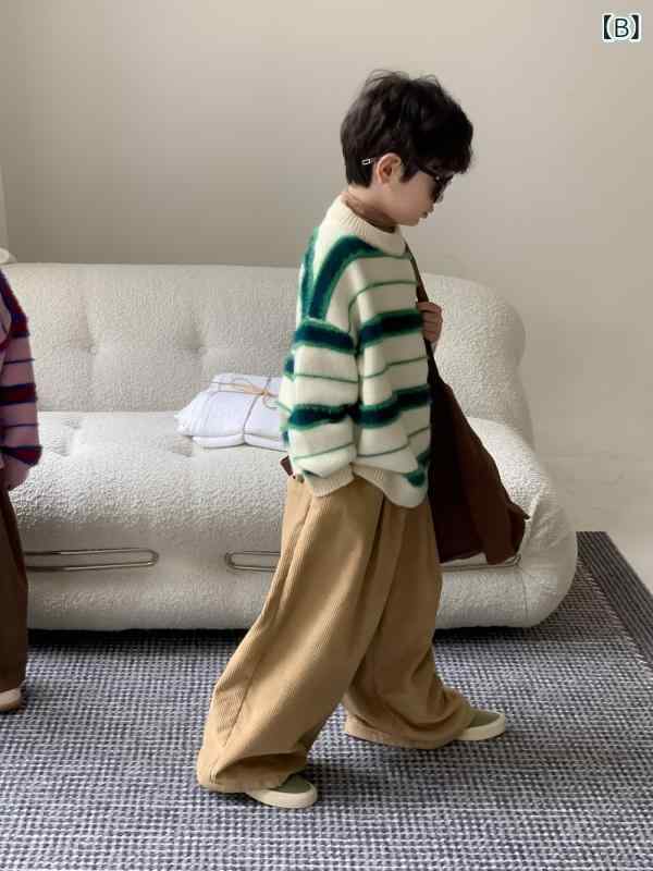 セーター キッズ 男女兼用 韓国風 ストライプ ボーダー ニット トップス ラウンドネック 丸首 ゆったり ルーズフィット 厚手 綿 コットン 普段使い 通園 通学 お出かけ かわいい 子供服
