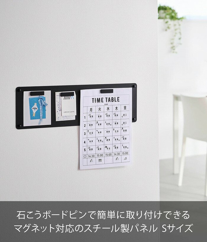 品番 / JAN山崎実業 tower( タワー )ウォールプリントスチールパネル S 石こうボード壁対応ホワイト:10153 / 4903208101530ブラック:10154 / 4903208101547サイズ約 幅 470mm×奥行き 7mm×高さ 150mm重さ約 710g素材本体:スチール( 粉体塗装 )耐荷重500g( 静止荷重 )※設置面の材質、強度、状態、環境などによって異なります。付属品石こうボードピンセット( 取り付けピース×4、クギ×12、キャップ×4 )、木ネジ×4、マグネット×3取り付け可能な壁面[ 石こうボードピン使用時 ]壁紙・布壁紙・ビニール壁紙貼りなどの石こうボード( 9.5mm以上 )、薄ベニヤ( 5mm以上 )※取り付けの際はコインなど平らな面を有する金具を別途ご用意ください。また薄ベニヤの壁に取り付ける際は、金槌を別途ご用意ください。[ 木ネジ使用時 ]柱、板壁( 10mm以上 )、プリント合板( 裏側に水平に桟がある場所 )、裏に下地材( 間柱 )が入っている壁※3mm程度のベニヤ板を挟んだ空洞の構造には取り付けできません。※取り付けの際は下穴をあけるキリ等の道具とプラスドライバーを別途ご用意ください。お手入れ・汚れや水分は乾いた布で拭き取ってください。・シンナー、ベンジンなどの薬品は使用しないでください。備考・石こう吸音ボード、ロックウール吸音板、しっくいやモルタル等のもろい壁、薄い板壁、鉄骨やコンクリートなどのかたい壁、タイルおよびタイルの目地などへの取り付けはできません。・石こうボードピンを使用した場合は壁にクギ1本あたり約1mm、木ネジを使用した場合はネジ1本あたり約4mmの穴が開きます。穴跡が残っても差し支えのない場所に取り付けてください。・重量の偏りがないよう、バランスよく収納してください。ご注意点※製品仕様やパッケージは改良のため予告なく変更される場合があります。※サイズや色味は個体により若干の差異が生じることがあります。※商品の色は、画面上の画像と実物とでは多少異なる場合があります。あらかじめご了承のうえ、お買い求めください。※マグネット面をペースメーカーなどの電子医療機器、スマートフォンなどの電子機器、磁気媒体などに近づけないでください。※付属のマグネットは、小さなお子さまやペットが触れない場所で使用・保管してください。万一、マグネットをお子さまやペットが飲み込んだ場合、身体に深刻な影響を及ぼす恐れがあり大変危険です。安全のためご注意ください。※万一落下した場合危険な場所、壁が振動する場所、直射日光の当たる場所や火の近く、高温・多湿になる場所、小さなお子さまやペットが触れるところ、屋外では使用しないでください。※購入間違いによる返品・交換はお受けいたしかねます。ご注文の前に種類やサイズ、型番などを十分ご確認ください。関連商品S・約 幅 470mm×奥行き 7mm×高さ 150mm>>L・約 幅 680mm×奥行き 7mm×高さ 350mm>>■【TOWER / タワー】シリーズは →★こちら★類似商品はこちら[ ウォールプリントスチールパネル タワー L3,850円 [ ウォールプリントボード タワー トレー付4,510円[ デスク横トレー付きスチールパネル タワー 4,400円[ マグネット冷蔵庫横隠せるスライドスチールパ5,830円 [ ウォールコーナーシェルフ タワー L 石2,970円[ ウォール隠せるルーター収納 タワー Sサイ2,640円[ マグネット棚 タワー スチールパネル対応 1,100円 [ ウォールフック タワー 3個組 石こうボ2,200円 [ 石こうボード壁対応マグネット用スチールバ2,530円新着商品はこちら2025/7/16[ インテリア低台車 リン ラウンド ]山崎4,950円2025/7/16ショール フロレゾン クロリス 45×180c9,240円2025/7/16ショール フロレゾン シュロー 45×180c9,240円再販商品はこちら2025/7/16アルジャンテ・デコトレー アンティーク風 トレ1,540円2025/7/16フラワーポット ジョーロポットカバー アンティ1,540円2025/7/16アルジャンテ・バードカップ アンティーク風 ト1,760円2025/07/16 更新tower タワー( 山崎実業 ) 石こうボード壁対応ウォールプリントスチールパネル S使い易くどんなシーンにも合わせやすい、TOWER タワー シリーズのご紹介です。■プリント類を見やすく貼り付け、マグネットがつく壁付けパネル。お好みの場所にマグネット収納スペースを手軽に作れる『 tower( タワー )ウォールプリントスチールパネル 石こうボード壁対応 』。付属の石こうボードピンか木ネジで、欲しい場所に簡単設置。お子さまの時間割表やお知らせプリントなどを管理しやすく壁面収納できます。フラットなデザインだから大きなプリント類もまっすぐ貼れて、すぐに使える同色のマグネットも付属。15×47cmの『 Sサイズ 』。■お好みの場所でプリント整理。リビングやキッチン、子ども部屋やワークスペースなどお好みの場所に設置できるスチール製壁掛けパネル。学校からのお知らせや回覧などを、見やすい場所に磁石で貼って保管。ペン受けが付いていないフラットなデザインだから、パネルより下に紙がはみ出しても曲がらずきれいに貼れます。■ピンや木ネジで簡単設置。設置する壁面に合わせて選べる、2種類