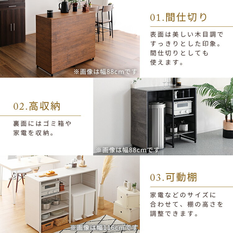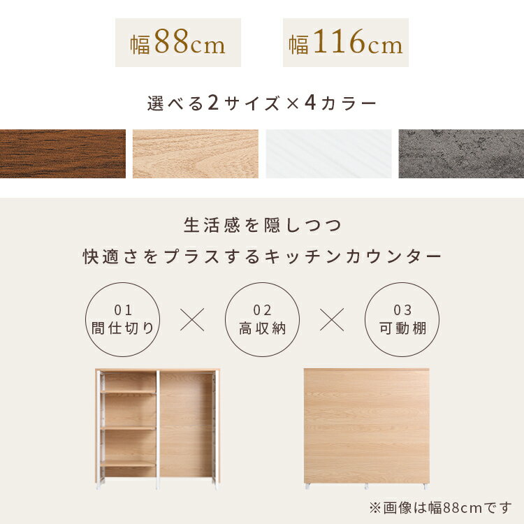 【商品について】キッチンカウンター【Brune-ブラン-】■サイズ:116cm幅…(約) 幅116x奥行40x高さ85cm88cm幅…(約) 幅88x奥行40x高さ85cm■耐荷重:2サイズ共通…天板:(約)20kg、棚板:(約)5kg/枚■カラー:2サイズ共通…ナチュラル、ウォールナット、ホワイト、コンクリートグレー■素材:〔天板 / 側板〕パーチクルボード・メラミン化粧繊維板 〔脚部〕スチール・粉体塗装■その他:116cm幅…梱包サイズ(約) 幅118.5x奥行43.5x高さ17cm88cm幅…梱包サイズ(約) 幅93x奥行43.5x高さ17cm 【関連キーワード】 キッチンカウンター 間仕切り 台 作業台 キッチンボード カウンターテーブル幅90 幅120 折りたたみテーブル 対面 食器棚 90cm 120cm アイランドカウンター アイランド型 スリム スチール 北欧 ヴィンテージ モダン キッチン 収納 キッチンラック カウンター収納 収納棚 おしゃれ シンプル 安い 食器棚カウンター 台所収納 キッチンデスク 90cm幅 120cm幅 対面式キッチンカウンターテーブル 対面式カウンター 対面式食器棚 対面キッチンカウンターテーブル ダイニングテーブル リビング 勉強机 リビング収納 炊飯器 ケトル 食器 ゴミ箱 ダストボックス ゴミ箱収納 仕切り 目隠し レンジ台 レンジラック 116cm 88cm シンプル仕様詳細商品名キッチンカウンター Brune-ブラン- サイズ116cm幅…(約)幅 116cm 奥行 40cm 高さ 85cm88cm幅…(約)幅 88cm 奥行 40cm 高さ 85cm 耐荷重天板:(約)20Kg、棚板:(約)5kg/枚※2サイズ共通 カラーナチュラルウォールナットホワイトコンクリートグレー※2サイズ共通材質天板・棚板 :パーチクルボード・メラミン化粧繊維板脚部 : スチール(粉体塗装)組み立て時間(約)60分 ※2サイズ共通注意※商品の仕様は、随時改良するように努めております。そのため、生産ロットにより品質に差し支えの無い程度で多少の変更が予告なく行われる場合がございます。リピート注文などで同じ仕様のものをご希望される場合はご注意ください。 ▼このページの撮影に使用している商品▼ ブレッドケース 円形 自動開閉ゴミ箱49L シャッター式自動開閉ごみ箱 ヴィンテージダイニング5点セット ▼その他人気のキッチン収納▼ キッチンカウンター ガラス扉食器棚 90cm幅キッチンボード 90cm幅鏡面ワイド食器棚 ▼その他人気のキッチン収納▼ バタフライ キッチンワゴン 日本製 180cm幅 組み合わせ自在のキッチンカウンター 120cm幅 ゴミ箱上キッチンカウンター 日本製 120cm幅 組み合わせ自在のキッチンカウンター