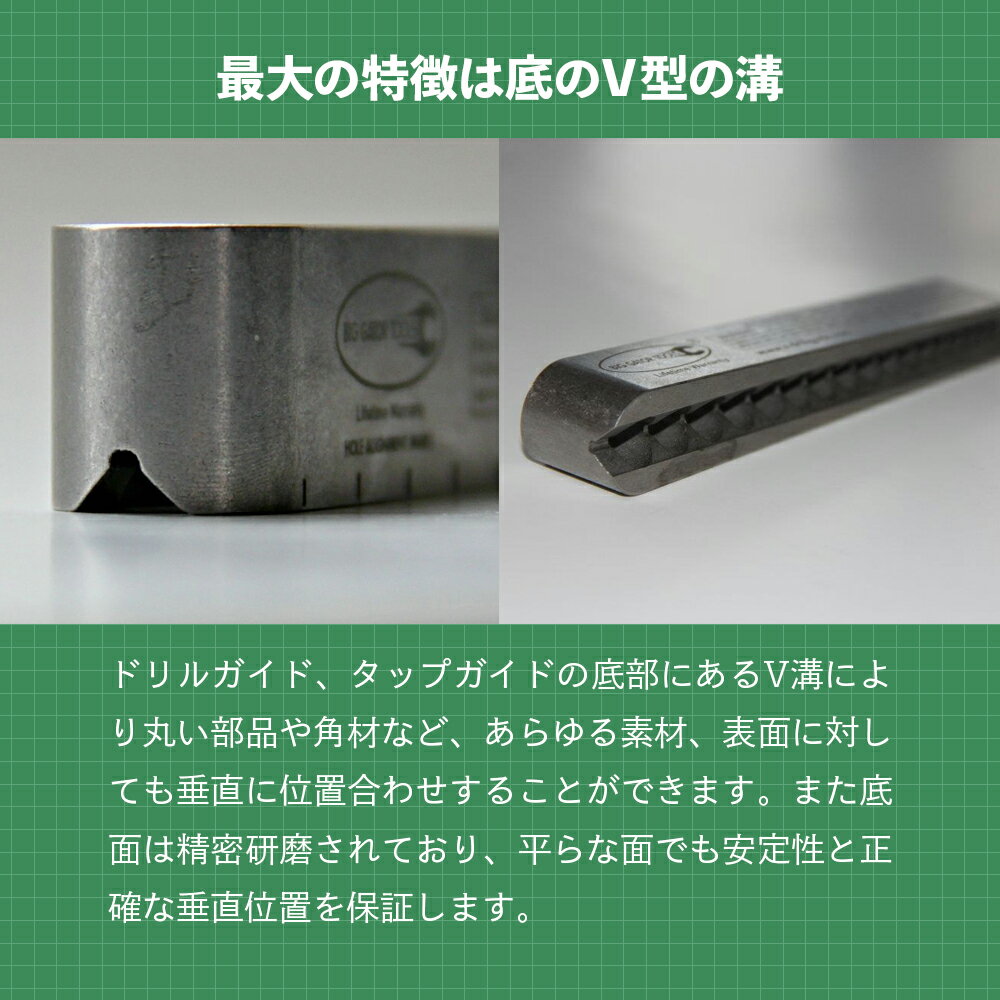 商品情報 ブランド ビッグゲーターツール BIG GATOR TOOLS 商品名 ミニ Vドリルガイド 商品説明 BIG GATOR TOOLS V-Drill Guide は、精密な位置合わせのためのポータブルボール盤のようなものです。 底部にあるV溝により丸い部品や角材など、あらゆる素材、表面に対しても垂直に位置合わせすることができます。また底面は精密研磨されており、平らな面でも安定性と正確な垂直位置を保証します。 使い方は簡単。ガイドを穴を開けたい位置に合わせてクランプなどで固定し、垂直にドリルまたはタップします。耐久性の高い熱処理された特殊ニッケル合金鋼で作られているので、いつでも安定した結果を提供してくれます。 ○21個のドリル穴サイズ:10 インチ、21 インチ、25 インチ、29 インチ、30 インチ、1/8 インチ、33 インチ、7/64 インチ、36 インチ、37 インチ、38 インチ、40 インチ、3/32 インチ、43 インチ、45 インチ、47 インチ、5/64 インチ、50 インチ、1/16 インチ、53 インチ、3/64 インチ ○10/32から0-80までのすべてのタップサイズをカバーします。 ○平面、丸面、角面に対応。 ○プラスチック、木材、金属に対応 ○ドリルガイドを材料に固定し、クランプしてドリルします。 ○特殊ニッケル合金鋼 ○100%アメリカ製。 ○ガイド本体にサイズ表記。 ○2016 Pro Tool Innovation Awards受賞。 商品詳細 ●色:グレー ●状態:新品 ●品番:SDGMINI ●ジグタイプ:ドリル ●材質:スチール ●製造:アメリカ ●UPC:855683004018ビッグゲーター SDGMINI ミニ Vドリルガイド 21ホール MINI V-DrillGuide 10〜3/64インチの21個ドリル穴を備え。10/32から0-80までのすべてのタップサイズをカバーします。 9