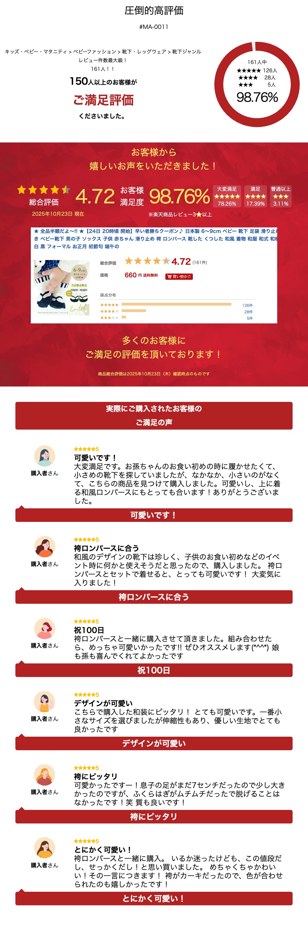 商品名 袴風ロンパース用靴下 品番 MA-0011 用途 お宮参りやお食い初め、その他さまざまなイベントに♪ 素材・サイズ・内容 ・本体素材/綿、ポリエステル、ポリウレタン ・サイズ/6cm〜9cm(約新生児〜6ヵ月) 商品説明 お食い初めやお正月、結婚式など記念に残るイベントに♪ 初節句やお食い初め・お宮参り・お正月などの行事の時に 足袋と草履を履いてる風になるかわいい靴下が登場! 当店人気の袴ロンパースとセットで着用するとオススメです♪ オールシーズンご使用いただけます。 お子様と一緒に特別な思い出の一時を....。 ※注意事項 ※ご使用の機器や照明などにより、実際の色と多少異なる場合がございます。 。 関連商品grattis 日本製 9〜12cm ベビー 靴下 足袋 滑り止めつき...grattis 日本製 9〜12cm ベビー 子供 靴下 滑り止めつき...【楽天1位!】 ベビー ハイソックス 靴下 フリル 0〜3歳 花柄 女...770円770円700円grattis 日本製 7〜9cm 子供 ベビー 靴下 滑り止めつき ...【楽天1位!】 ベビー ハイソックス 靴下 5足 セット 無地 キッズ...【楽天1位!】 ベビー 袴 ロンパース 男の子 初節句 衣装 お食い初...660円1,380円2,460円【楽天1位!】 赤ちゃん ベビー 袴 髪飾り リボン ヘアバンド ひな...【楽天1位!】 ベビー 袴 ロンパース 男の子 名入れ 名前 お食い初...【楽天1位!】 綿100% ベビー袴 ひなまつり 衣装 ベビー 袴 ロ...780円3,680円2,480円ベビー 靴下 メッシュ 夏 滑り止め 3足 セット 春 秋 冬 赤ちゃ...【楽天1位!】 ベビー 袴 ロンパース 女の子 ひなまつり 衣装 60...7万人が選んだ♪ ベビー袴 男の子 お食い初め 服 ベビー 袴 ロンパ...1,480円3,970円2,480円お宮参りやお食い初め、その他さまざまなイベントに♪ 初節句やお食い初め・お宮参り・お正月などの行事の時に 足袋と草履を履いてる風になるかわいい靴下が登場! 当店人気の袴ロンパースとセットで着用するとオススメです♪ 袴風ロンパース用靴下 【品番】 MA-0011 【用途】 お宮参りやお食い初め、その他さまざまなイベントに♪ 【素材・サイズ・内容】 ・本体素材/綿、ポリエステル、ポリウレタン ・サイズ/6cm〜9cm(約新生児〜6ヵ月) 【商品説明】 お食い初めやお正月、結婚式など記念に残るイベントに♪ 初節句やお食い初め・お宮参り・お正月などの行事の時に 足袋と草履を履いてる風になるかわいい靴下が登場! 当店人気の袴ロンパースとセットで着用するとオススメです♪ オールシーズンご使用いただけます。 お子様と一緒に特別な思い出の一時を....。 ※注意事項 ※ご使用の機器や照明などにより、実際の色と多少異なる場合がございます。 商品カテゴリ:子供服 ベビー服 こどもの日 初節句 端午の節句 衣装 和服 着物 長袖 フォーマル 七五三 お正月 一生餅 百日祝い お食い初め お宮参り 出産祝い ギフト 誕生日 春夏秋冬 9〜10