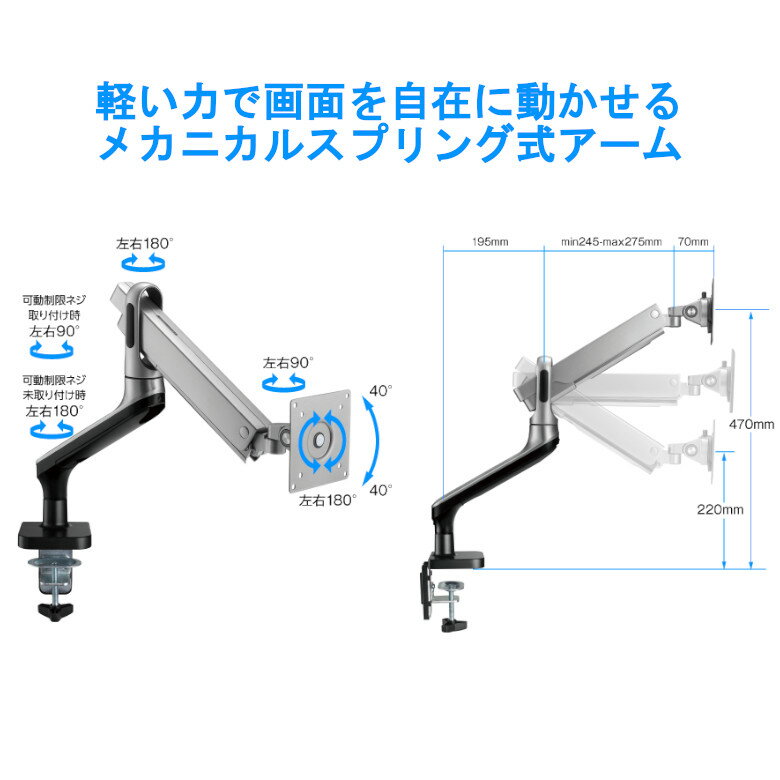 メカニカルスプリング式 液晶ディスプレイ用アーム4軸モデル 画面の前後移動ができる4軸タイプ 軽い力で画面を自在に動かせるメカニカルスプリング式アーム ディスプレイの取り付けが簡単なセパレート式 2通りの設置方法に対応、しっかり固定するから転倒に強い 縦位置での使用も可能 アームのスプリングの固さが分かるインジケーター付き ■目安対応モニターサイズ:17インチ(17型),19インチ(19型),20インチ(20型),22インチ(22型),23.6インチ(23.6型),23.8インチ(23.8型),24インチ(24型),24.5インチ(24.5型),27インチ(27型),30インチ(30型),32インチ(32型) ■対応モニターメーカー例:※すべてのモニターに対応できるわけではございません。必ず商品ページの適合条件をご確認ください。IO DATA(IOデータ)・iiyama(イイヤマ)・AOC・Acer(エイサー)・ASUS(エイスース・アスース)・EIZO(ナナオ)・HP(ヒューレッド・パッカード)・LGエレクトロニクス(LG Electronics)・シャープ(SHARP)・DELL(デル)・フィリップス(PHILIPS)・ViewSonic(ビューテック)・BenQ(ベンキュー)・JAPANNEXT・NEC・Lenovo(レノボ)・ADTECHNO・プリンストン・MSI・Pixio・GIGABITE(ギガバイト)・ZOWIE・ROG・Optix・TUF Gaming・ProLite・FlexScan・UltraGear・NITRO・GigaCrysta・ProArt・MultiSync・DuraVision・AlphaLine・plus one・LUCA・Vero・ThinkVision・AQCOLOR・ZenScreen・MOBIUZ・ColorEdge・G-MASTER・BRAVIA・Predator・ALIENWARE対応規格VESAマウントインターフェース規格(FPMPMI)75mm / 100mm耐荷重2.0〜9.0kg対応サイズ17〜32インチまでディスプレイ取付部可動範囲チルト(傾き): 上40°/ 下40°パン(首振り): 左90°/ 右90°回転: 左180°/ 右180°高さ 220〜470mm寸法W115×D550×H630(mm)重量約3.0kg保証期間3年間取り付け可能天板(クランプにて取り付ける場合)厚さ:10mm〜80mm奥行:105mm以上幅:105mm以上(グロメットにて取り付ける場合)厚さ:10mm〜80mm奥行:105mm以上幅:105mm以上さらに、天板に直径10〜20mmの穴があること。
