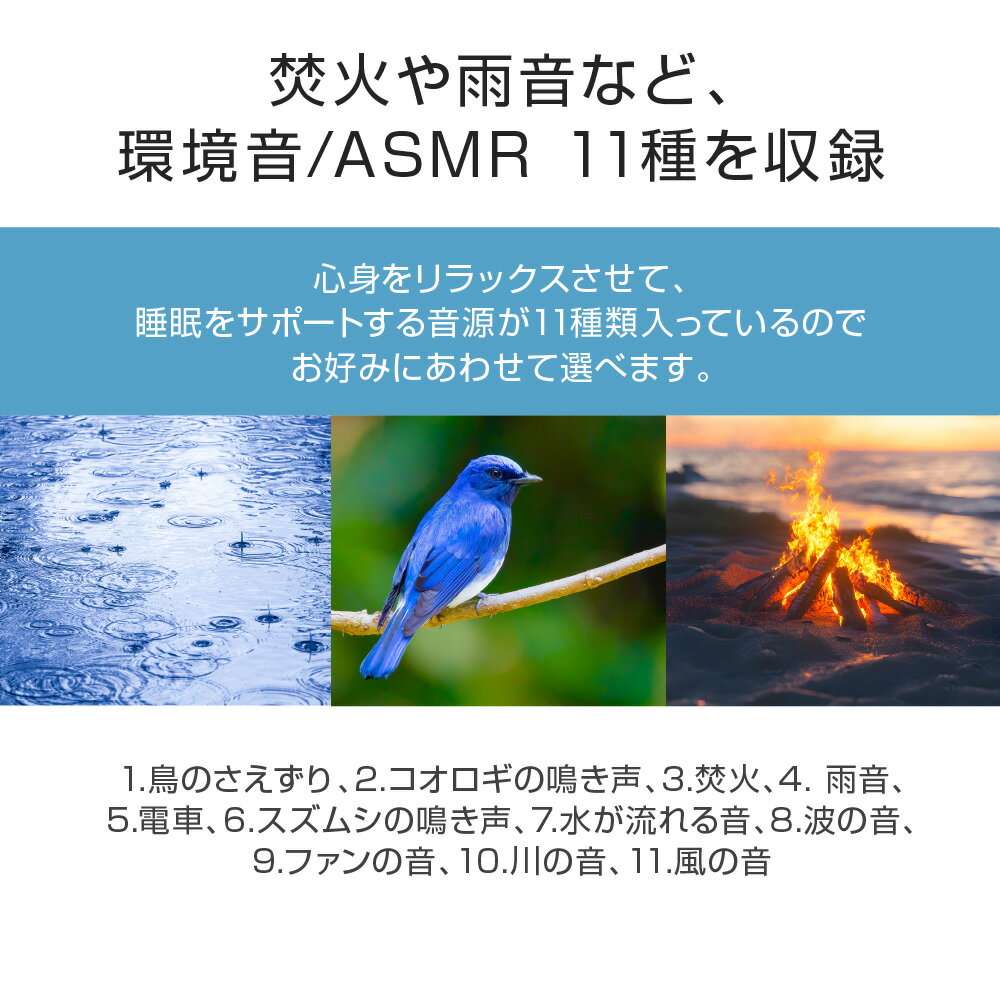 【製品特徴】 枕で聴ける骨伝導スピーカー 枕の下に入れれば骨伝導で枕から音楽が流れます。 イヤホンを着ける煩わしさがなく音楽を聴きながら睡眠できます。耳を塞がないので快適に使用できます。 焚火や雨音など環境音/ASMR 11種を収録 心身をリラックスさせて睡眠をサポートする音源が11種類入っているのでお好みにあわせて選べます。 1.鳥のさえずり 2.コオロギの鳴き声 3.焚火 4.雨音 5.電車 6.スズムシの鳴き声 7.水が流れる音 8.波の音 9.ファンの音 10.川の音 11.風の音 暗い所でも表示内容が確認できるLEDディスプレイ採用 Bluetooth5.3対応 スマホの音楽を流せる microSD対応でお好みの音楽リストを再生可能 最大64GBのmicroSDXCカードまで対応しています。 30分/60分/120分のオフタイマー 充電式で8時間使用可能 USB Type-C端子からの充電で約8時間使用できます。 持ち運びに便利なポーチ付き コンパクトに持ち運べ旅行や出張にも便利です。 【製品仕様】 スピーカー部 チャンネル2.0Ch 再生周波数帯域200Hz~20kHz 最大出力0.9W×2 入力端子 外部メモリーmicroSDカードスロット 電源入力USB Type-C Bluetooth バージョンVer.5.3 無線出力class2 対応プロファイルA2DP、AVRCP 対応コーデックSBC 使用周波数2.4~2.480GHz マルチペアリング6台 最大通信距離10m microSD 対応規格microSD/microSDHC/microSDXC(~64GB FAT/FAT32) 対応コーデックMP3、WAV その他 電源DC5V/1A (USB給電) 内蔵バッテリーリチウムイオン電池(400mAh) 充電時間約3時間 連続再生時間約8時間(音量70%) 外形寸法W37×D157×H11(mm) 重量約48g 動作温度範囲0℃~40℃ 動作湿度範囲0%~90% 生産国中国 保証期間6ヶ月間 【付属品】 専用充電ケーブル(25cm)、専用ポーチ、取扱説明書/保証書 【ご使用上の注意】 ※送信距離や使用時間は環境や状況によって異なります。 ※対応するBluetooth機器であっても動作できない場合があります。 ※携帯電話の操作方法はご使用の携帯電話の取扱説明書をご覧ください。 ※耳をあまり刺激しないよう適度な音量でお使いください。大音量で長時間続けて聴くと聴力に悪影響を与えることがあります。 ※暖房器具の近く高温やほこりの多い場所に置かないでください。 ※直射日光に当たる場所に長時間置かないでください。 ※Bluetoothは米国Bluetooth SIG,Inc.の登録商標です。 ※製品画像の色は実際の製品と異なる場合があります。 ※製品のデザイン仕様は改良などにより予告なしに変更する場合があります。 ※記載されている商品名製品名は各社の商標または登録商標です。 ※開封についてケガのないようお取り扱いにご注意ください。 【検索キーワード】 GH-SPBL209 GH-SPBL209-GY GH-SPBL209-PK GH-SPBL209-WH 4511677143168 4511677143175 4511677143182 ワイヤレスピロースピーカー 枕スピーカー 骨伝導スピーカー Bluetoothスピーカー ASMRスピーカー 睡眠用スピーカー 快眠グッズ 睡眠改善 リラックス 癒しグッズ 就寝用スピーカー 寝室用スピーカー microSD再生 LEDディスプレイ搭載 オフタイマー付き USB充電式 8時間連続再生 コンパクト 軽量 ポータブル ピロースピーカー 枕下スピーカー 寝ながら音楽 枕で聴けるスピーカー 旅行用 出張用 快眠サポート 安眠グッズ 癒しサウンド ASMR sleep sound relaxation GREEN HOUSE wireless pillow speaker bone conduction bluetooth5.3 portable speaker眠りをサポートする骨伝導ワイヤレスピロースピーカー GH-SPBL209は枕の下に置くだけで音楽や環境音を楽しめる骨伝導ワイヤレスピロースピーカーです。 イヤホンを着けずに快適に音楽を聴きながら眠れるため睡眠サポートに最適です。 ASMRや自然音を含む11種類の環境音を内蔵しリラックス効果を高めBluetooth5.3接続やmicroSD再生にも対応。 30分60分120分のオフタイマーや8時間連続使用が可能で旅行や出張にも便利なポーチ付き。 寝室や旅先で手軽に快眠環境を整えられるGREEN HOUSEのスピーカーです。