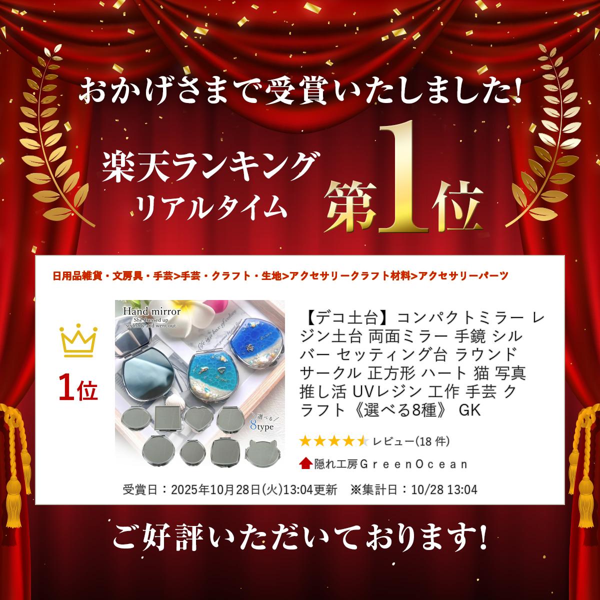 オーソドックスなサイズのコンパクトミラーです。表面はレジンを流す溝が付いているので、着色したレジンを流したり好きなパーツで飾ってね♪※製造上避けられない傷やレジンの流し込み部分にサビ、汚れ等がある場合がございます。※フタが少しズレたり少し隙間がある場合があります。(フタが閉まらないものはありません。)※上記の理由での返品対応は致しかねます。(蓋が完全に閉まらないなど機能面に関しては不良対象となります)○数量:1個○サイズ:ラウンド約72×77mm、流し込み部分約66×66mm ラウンド小約65×61mm、流し込み部分約53×53mm ふっくらスクエア約72×66mm、流し込み部分約57×57mm ハート約68×70mm、流し込み部分約53×63mm スクエア約66×60mm、流し込み部分約53×53mm オーバル約63×71mm、流し込み部分45×60mm シェル約65×62mm、流し込み部分約51×54mm キャット約66×80mm、流し込み部分約57×68mm○カラー:シルバー(表記のサイズは目安です。実際の寸法は個々に若干異なる場合がございます。)★ゆうパケット配送OK (ただし、代金引換ご希望の方、ゆうパケット配送NGの商品が含まれる場合はゆうパックでのお届けとなります。)
