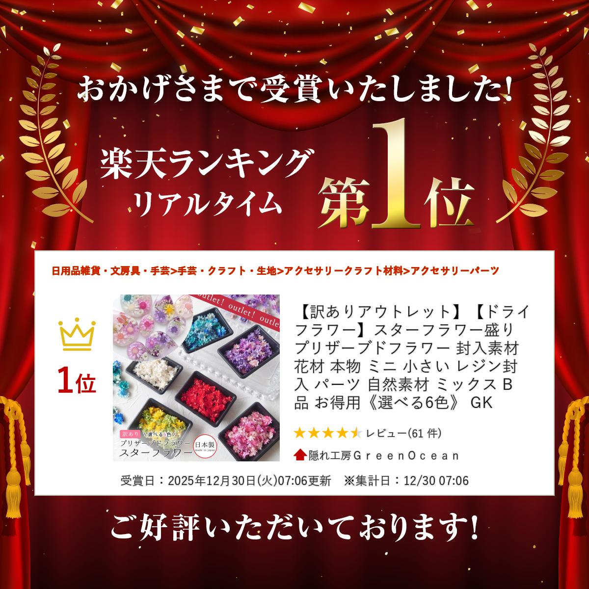 ◆商品説明◆検品でNGだった通常販売ができない訳ありスターフラワーです。盛りっと約60~70輪!たっぷり入っています。(お花の大きさにより数量は前後します)訳あり箇所以外を使用したり、練習用や、アイデア次第でまだまだ使える!封入に使ったり、組み合わせたり。可愛くアレンジしてみてね♪プリザーブドだから、ドライフラワーより色が長持ちするよ♪価値ある訳ありを楽しんでね!画像にない種類をお届けする場合もあります。あらかじめご了承の上ご購入ください。返品対応は致しかねます。※ご心配な場合は購入前にお問い合わせください。《不良品の主な内容》・色ムラ・欠け 破れ・大小サイズが混ざっている・花びらの枚数が少ない など※これらが重複しているものもあります。レジン封入としてお使いいただけるプリザーブドのスターフラワーです。プリザーブドフラワーは、一番美しい時期に色素を抜き取り、特殊な加工を施してあるため、生花のような柔らかい手触りとみずみずしさにより近い状態を長期間お楽しみいただけます。◆関連商品◆見本作品に使用しました♪商品型番:26712-G 楕円と雫 シリコンモールド◆スペック◆○数量:約60~70輪前後(お花の大きさにより数量は前後します)○サイズ:画像参照○ケースサイズ:約55×75×12mm○カラー:ブルーミックス・ピンクミックス・パープルミックス・イエローミックス・オフホワイト・レッド◆注意事項◆○天然のものですので、花のシワや破れ、花びらの折れ、色の濃淡が異なるものなど個体差が生じます。○天然素材のため、紫外線(UVライトなど)にあたると減色することがあります。○使用するレジンの種類により、レジンの内容成分が異なるため退色することがあります。○表記のサイズは目安です。実際の寸法は個々に若干異なる場合がございます。○生産ロットにより同じカラーでも色味の違いがある場合がございます。★ゆうパケット配送OK(ただし、代金引換ご希望の方、ゆうパケット配送NGの商品が含まれる場合はゆうパックでのお届けとなります。)