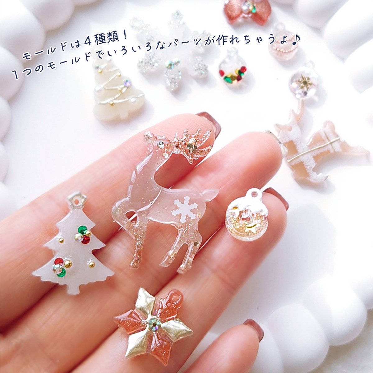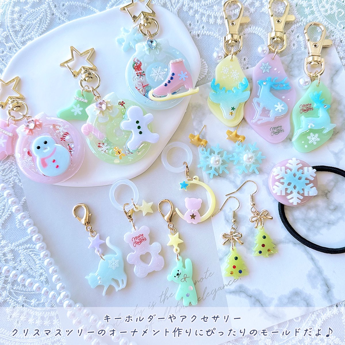 ◆商品説明◆1つのモールドでいろいろなパーツが作れちゃう♪キーホルダーやアクセサリー、クリスマスツリーのオーナメント作りにぴったりのシリコンモールド。通し穴付きだから、ヒートン不要で作品に仕上がるよ!かわいくアレンジして楽しんでね^^ Aタイプはクリスマスツリーや雪の結晶、星や月が作れるよ♪Bタイプはテディベアやネコちゃん、月のモチーフ。三日月に座るかわいいポーズも♪Cタイプはベルやリース、手ぶくろにくつ下、ソリやジンジャークッキーなどクリスマスモチーフがたっぷり♪Dタイプはさまざまなポーズのトナカイ。ハートやリボンなどの小さなデコパーツも作れるよ♪◆関連商品◆クリスマスモールドは他にもいろいろあるよ♪ CHECKしてみてね!商品型番:20727-G クリスマスハウスのカシャカシャ シリコンモールド商品型番:26105-G スノーマンのカシャカシャ シリコンモールド商品型番:26122-G クリスマスリースのカシャカシャ シリコンモールド見本作品に使用しました♪商品型番:27702-G アンブレラマーカー◆スペック◆○数量:1個○モールドサイズ:A約115×113×5mm B約110×118×5mm C約110×119×5mm D約117×115×5mm○完成サイズ:画像参照○素材:シリコン◆注意事項◆○表記のサイズは目安です。実際の寸法は個々に若干異なる場合がございます。○生産ロットにより同じカラーでも色味の違いがある場合がございます。◆モールド全般の注意事項◆~海外生産の為どうしても避けられません~○やすりやコーティング剤などでカバーが出来ると判断したものについては『良品』としており、返品対象外です。○お買い求めやすい商品価格の維持のため、下記を考慮した販売価格となっております。何卒ご理解、ご了承のうえお買い求め下さい。※完成作品にくもりのようなものができてしまうことがあります。※完成作品の表面にキズ、擦りキズ、線、スジ、うろこ模様などができてしまうものもあります。※完成作品に影響が無い部分の汚れ、多少のサイズの誤差等は良品の範囲内とさせていただきます。※多少の歪み、厚みの高低差がある場合がございます。※シリコン型は消耗品です。使用回数を重ねる毎に劣化していきます。消耗具合は使用方法などにより異なるようです。※使用するレジン液や着色剤、ライトの種類によって、モールドの傷みが早まる可能性がございます。※型の色やサイズ、硬さは入荷ロットごとに異なる場合がございます。作成出来る形が同じ場合は同一商品扱いとさせて頂きます。[表面をつるつるに仕上げるには]・キズ、線、スジ、うろこ模様などがある面に薄くレジン液を塗り再度硬化させることで表面がつるつるになります。キズなどがない場合も仕上げに表面をレジンコーティングすることで、作品がより美しく仕上がります。コーティング専用レジン液のまさるコート(商品型番:21796-G)やフィニッシュプログロッシー(商品型番:15211-O)もおすすめです。★ゆうパケット配送OK(ただし、代金引換ご希望の方、ゆうパケット配送NGの商品が含まれる場合はゆうパックでのお届けとなります。)