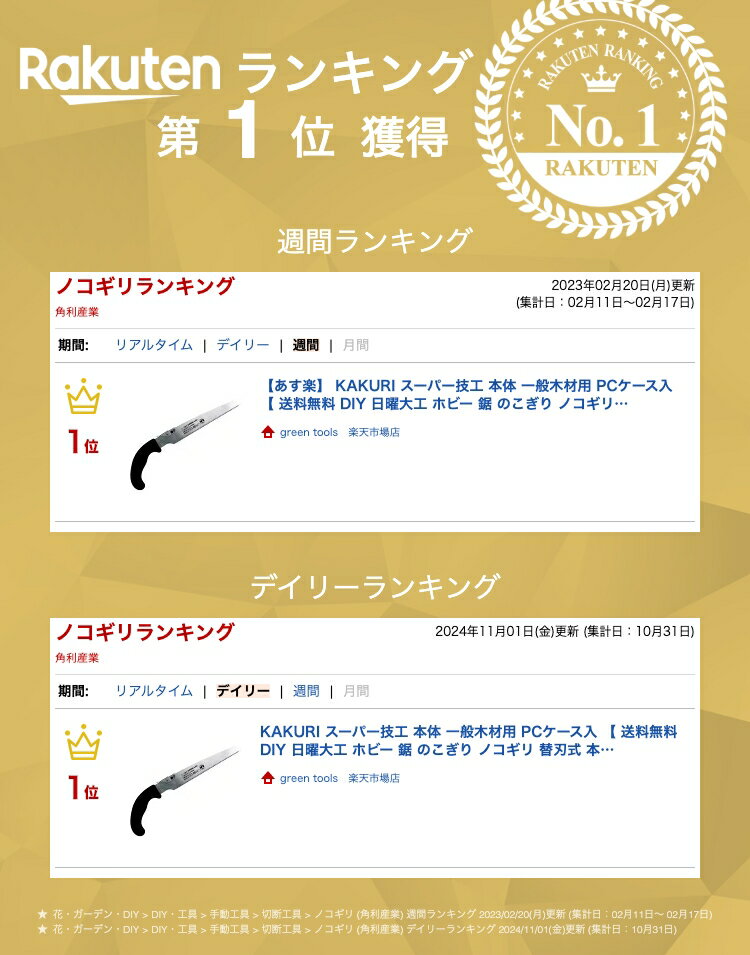 サイズ全長:350mm 刃長:210mm 刃厚:0.6mm重量本体:168g ケース:40g材質刃:炭素工具鋼 柄:スチール、PA(強化ナイロン)、TPR(合成ゴム) ケース:ポリプロピレン付属品刃先収納用プラスチックケース 関連商品【4日20時よりクーポン配布】 KAKURI スーパー技工 本体 竹用...【4日20時よりクーポン配布】 KAKURI スーパー技工 本体 万能...【4日20時よりクーポン配布】 KAKURI スーパー技工 本体 小枝...2,080円2,080円2,080円【4日20時よりクーポン配布】 KAKURI スーパー技工 本体 塩ビ...【4日20時よりクーポン配布】 KAKURI スーパー技工 本体 合板...【4日20時よりクーポン配布】 KAKURI 木サヤ付剪定鋸 ( 上製...2,080円2,080円3,380円【4日20時よりクーポン配布】 KAKURI スーパー技工 専用 替刃...【4日20時よりクーポン配布】 KAKURI スーパー技工 専用 替刃...【4日20時よりクーポン配布】 KAKURI スーパー技工 替刃 万能...798円798円798円一般木材用のこぎり■木材の切断加工に最適 一般木材用は一枚板や角材、ベニヤなどの一般的な無垢材の切断加工に特化しています。 特に針葉樹などの柔らかい木材に適しています。便利で経済的な替刃式のこぎり■用途に合わせて刃をチェンジ 専用替刃(別売)を付け替えることで様々な素材を切断加工できます。刃を交換するだけで良いので材料に合わせてのこぎりを買いそろえる必要がなく、経済的です。■材料に合わせた6種類の替刃 各素材用の6種類の専用替刃をラインナップ。木材・合板・塩ビ・竹などの様々な素材に対応可能。■便利な収納ケース付き 鋸刃を保護する専用ケースが付属。刃の傷みやケガなどを防止できる。ケースには本体の他、替刃を3枚収納することができます。 サイズ全長:350mm 刃長:210mm 刃厚:0.6mm重量本体:168g ケース:40g材質刃:炭素工具鋼 柄:スチール、PA(強化ナイロン)、TPR(合成ゴム) ケース:ポリプロピレン付属品刃先収納用プラスチックケース 【関連キーワード】 DIY 日曜大工 ホビー 鋸 のこぎり ノコギリ 替刃式 本体 木材 合板 コンパネ 塩ビ アクリル 小枝 剪定 KAKURI アウトドア キャンプ キャンパー ソロキャン 万能 ステンレス 粗ゴミ 荒ゴミ 粗大ゴミ 鉄 木 刃 波型 スムーズ コンパクト いろいろ切れる 握りやすい 分別 解体 断捨離 片付け グッズ