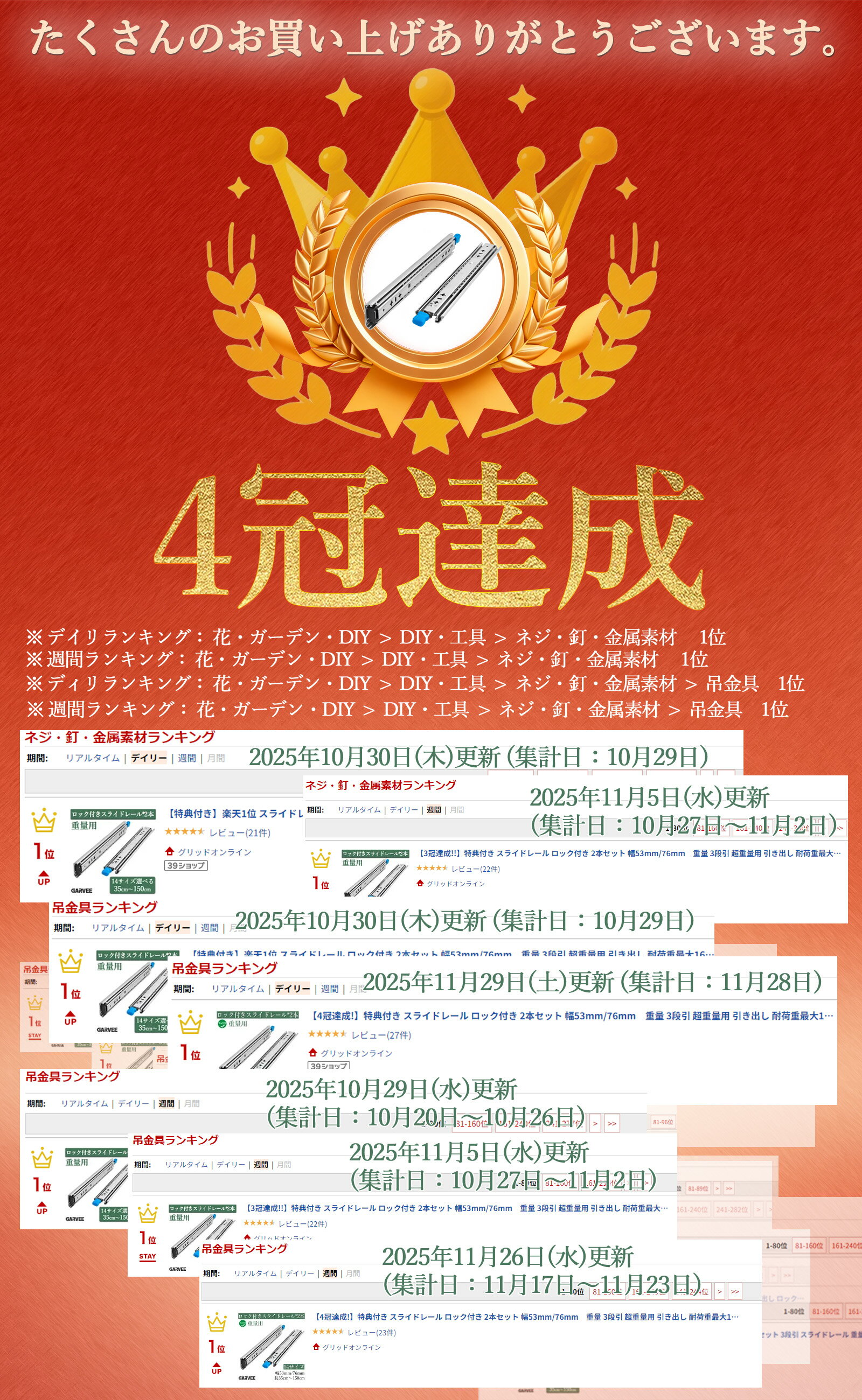 【4冠達成!】特典付き スライドレール ロック付き 2本セット 幅53mm/76mm 重量 3段引 超重量用 引き出し 耐荷重最大160Kg レール スチール 棚 キャビネット 商品棚 展示用 産業用引き出し トラック 車改造 レール 工業用 DIY 350mm 400mm 550mm 1500mm RoHS対応品