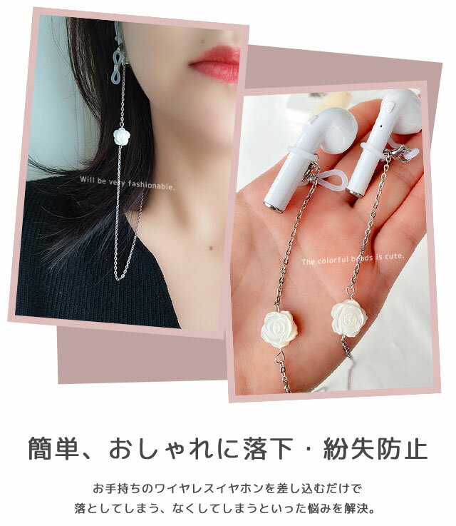 【メール便送料無料】GPT ワイヤレスイヤホン 落下防止 紛失防止 イヤホンストラップ ネックストラップ イヤホンホルダー バラ ローズ ビーズ チェーン 首下げ アクセサリー レディース gu1b997-mail(gu1b998)