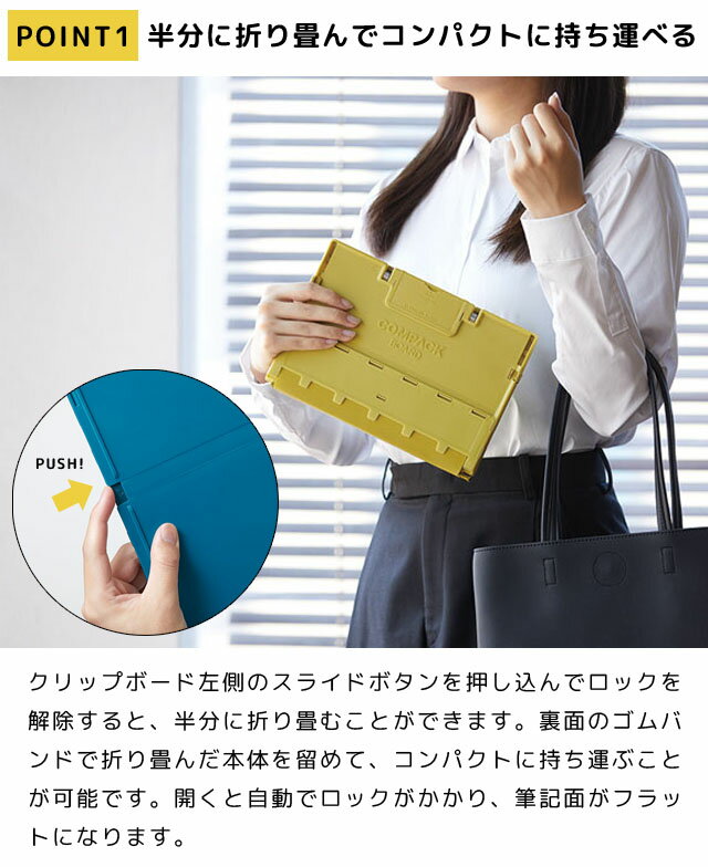 【検索ワード】コンパック/バインダー/ファイル/ボード/畳める/半分/2つ折り/A5/書類ケース/画版/便利/便利グッズ/クリップファイル/クリップバインダー/文具/文房具/オフィス用品/事務用品/作業/作業用/仕事/仕事用/営業/接客/案内/イベント/ナース/看護師/介護士/ペンホルダー/チラシ/フライヤー/プリント/収納/アンケート/バインダーファイル/下敷き/工場/現場/倉庫/書類入れ/書類収納/会議/移動/学校/ハード/硬い/プラスチック/ビジネス/出張/A4ケース/A4サイズ/筆記具/ロック付き/製造現場/現場仕事/現場作業/医療/介護/おしゃれ/機能的/実用的/男性/女性/メンズ/レディース/母の日/父の日/敬老の日/お祝い/贈り物/お返し/ギフト/プレゼント/就職祝い/入学祝い/進級/新社会人/就活/就職活動/説明会/高校生/大学生/屋外イベント/スマート/メモ/アイデア/雑貨/資料/5785-B/5785-Y/5785-W/5785-BK/青/ブルー/黄色/イエロー/白/ホワイト/黒/ブラック/無地/シンプル/無柄/ノンキャラ/文具大賞/2025/【RCP】半分に折り畳んで、コンパクトに持ち運べるクリップボード「COMPACK コンパック」。 開くと自動でロックがかかり、筆記面がフラットになります。 クリップボード左側のスライドボタンを押し込んでロックを解除すると、半分に折り畳むことが出来ます。 書類を挟んだまま折りたたむことが出来ます。折り畳んだ際、クリップボード内側に隙間があるため、書類に折り目がつきにくい! 品番 5785 展開時サイズ(約) H335×W237×D13mm 折りたたみ時サイズ(約) H165×W237×D23mm 対応サイズ A4 短辺とじ 収納枚数 約15枚(コピー用紙) 重量(約) 275g 材質 PP、ABS、POM 製造国 ベトナム メディア紹介 (扶桑社ムック)文具屋さん大賞2024「クリップ賞」【第8位受賞!】 メール便配送時のご注意 ※配送方法「メール便」をご選択いただいた場合は、メール便既定の箱に収めるため、パッケージから出して折りたたんだ状態での梱包となります。商品の使用に差支えはございませんが、ギフト等での配送をご希望の場合は宅配便での配送をお勧めします。 納品目安 営業日(土日祝除く)の15時までのご注文は即日発送致します(在庫ある場合)。 当店在庫切れの場合はメーカー取り寄せ。7営業日以内に発送予定(在庫がある場合)。 ※振込でのお支払いは、ご入金確認後となります。 ※土日祝はお休みです。 【あす楽対応*条件要確認】あす楽用締め時間、対象エリア等、条件があります。 ※配送方法「メール便」をご選択の場合はあす楽適応外となります。 特記