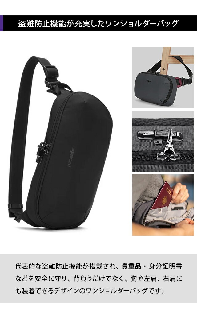 防犯用 PacSafe スキミング防止 パックセーフ ワンショルダー バッグ ボディバッグ スリングバッグ 斜め掛け 貴重品 収納 ロック付き キーフック V アーバンスリング RFIDブロック ポケット 海外旅行 セキュリティ 正規品 12970336(ei0a278)【あす楽対応】