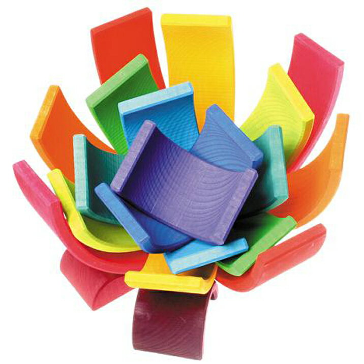 グリムス社を代表するアーチ型積木。 中心から外側にむかうにつれて、 だんだんアーチが大きくなっていきます。 グリムス社が得意とするグラデーションで子ども達の好奇心をくすぐります。 不思議なトンネルや、きれいなバランスシーソーと、 遊び方は子ども達の数だけあります。このアーチレインボーは、 遊びながら楽しみながら大きさの違いや順序に気付かせてくれるでしょう。