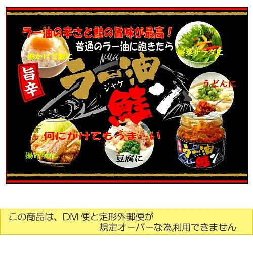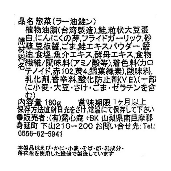 品名:惣菜(ラー油鮭ン) 原材料:植物油脂、鮭、粒状大豆蛋白、にんにくの芽フライドガーリック、砂糖、豆板醤ごま、鮭エキスパウダー、醤油、食塩、魚介エキス酵母エキス、食物繊維/調味料(アミノ酸等)、着色料(カテノロイド、赤102、黄4、銅葉緑素)、酸味料、乳化剤、香辛料、酸化防止剤(V.E)、(一部に小麦・大豆・さけ・ごま・ゼラチンを含む) 内容量:180g 保存方法:直射日光を避け常温にて保存してください。