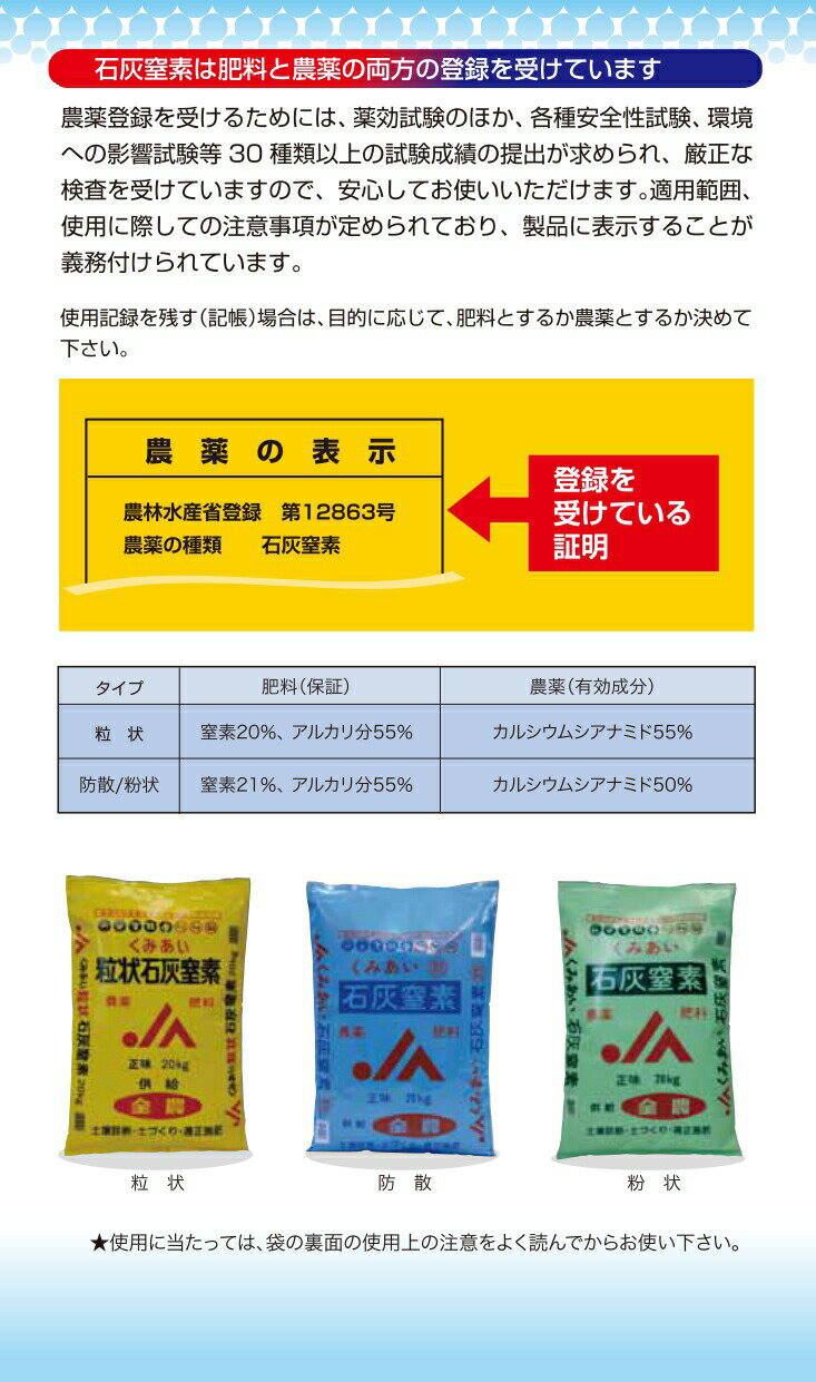 期間限定【特価販売中】 デンカ 防散石灰窒素 国産 20kg 肥料 農薬 土壌消毒 家庭菜園 園芸 ジャンボタニシ スクミリンゴガイ 駆除 家庭菜園 園芸 ガーデニング 送料無料 土壌改良剤 土づくり、肥料効果に加えて、農薬効果を兼ねそなえた肥料です。ジャンボタニシ(スクミリンゴガイ)の駆除にも。 【特徴】「まくだけで土壌消毒!病気・雑草を防ぐ」●畑や家庭菜園の“土の疲れ”が気になる方におすすめ!●「石灰窒素」は、まくだけで土の中の病気や雑草の種を抑え、健康な土づくりをサポートします。●石灰と窒素のW効果で、病気に強く・育ちやすい土へ。●長年プロ農家にも選ばれている安心の定番資材です。【使用方法】「畑・家庭菜園どちらにも」●は種、苗の植付に先立ち、夏期は3〜5日前、冬期は7〜10日前に散布し、土とよくまぜて下さい。●他のPK化成肥料と一緒に施せば効果的です。●施肥量はあくまで目安です。作型、地域、土壌条件、前作により適宜加減して下さい。 5 ▲散布しやすく窒素成分が土壌に保持されやすい為、肥効が長く持続◎流亡が少ないので環境への負担も抑えられる◎ 5