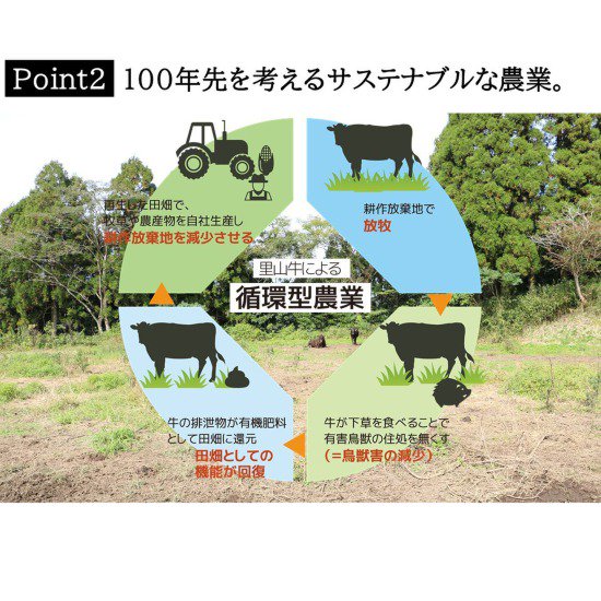 商品情報 内容量 焼肉用カルビ200g 原産地 鹿児島・宮崎・他 保存方法 -18℃以下 注意事項 本来、牛肉は鮮やかな赤色ではなく、黒っぽい色をしています。真空パックされた牛肉が沈んだ色に見えますが、開封後酸素に触れることで赤色に発色します。変色しているように見えることがございますが、品質等には問題ございません。 また、部位によっては色の変化が少ないことがありますが問題ございませんのでご安心ください。 ※牛の個体差がありますので、一枚あたりの肉の量や形、脂のつき方に差が生じてしまいますが、予めご了承くださいますようお願い申し上げます。 販売者 株式会社オービジョン鹿児島県鹿児島市名山町9番15号香り高くしっかりした赤身の味わいをお楽しみいただけます。食べ疲れしにくい、さっぱりとお召し上がり頂けるお肉です♪ 赤身肉の特徴として、火を入れ過ぎると肉が固くなってしまいます。火の入れ過ぎにはご注意ください。 餌には自然に生えている草と自社農場で生産した牧草飼料(非遺伝子組み換え)のみを与え、肥育期間中、穀物飼料は一切使用せず、お客様の安心安全を追求しています。 余分な脂がなく、赤身の旨みが詰まった牛肉本来の濃厚な味わい。牧草由来の栄養素が豊富でお肉好きだけでなく、美容や健康に関心が高い人にも好まれる一品です。 黒毛和牛の適度な脂と赤身の旨み・風味が詰まった牛肉を是非ご堪能ください。 《さかうえの取り組み》 さかうえでは、自然に近いストレスの少ない環境でのびのびと育った黒毛和牛に、自家産牧草飼料を与えることで、赤身でありながら適度にサシが入った牛肉に仕上げました。草食動物本来の育ち方により、牛肉本来の味わいや風味をお楽しみいただけます。 我々の暮らす中山間地域では山間の小さな農地が点在している地域も多く、さらに獣害や昨今の異常気象による収穫量減、さらには農家の高齢化により、利用されない農地が年々増加の一途をたどっています。これは、我々が暮らす鹿児島県志布志市に限ったことではありません。全国の地方で起こっている共通の課題です。 そこで、年々高まる赤身肉のニーズと地方の課題をともに解決することにチャレンジしていこうと考えています。 〜SDGsについて〜 持続可能な循環型農業を目指し、具体的に以下の取り組みを行っております。 (1)耕作放棄地等の休耕地に牛を放牧することで、牛が伸びた草を食べ、有害鳥獣の温床を無くす (2)牛の排泄物が有機肥料として田畑に還元され、田畑の機能回復を促す (3)再生した田畑で牧草飼料を生産し、再び牛を田畑に放牧する 《里山牛とは》 里山の保全と農村地域でのびのびと育った牛を【里山牛】と名付けました。 未利用地などの地域資源を有効活用して牛を育てることで、牛が伸びっぱなしになった草を食べて有害鳥獣の温床をなくし、鳥獣害を抑えることに繋がると同時に、牛の排せつ物が有機肥料として田畑に還元され、田畑としての機能が回復する。再生した田畑で牧草飼料を生産することで、輸入穀物飼料に頼らない持続可能な循環型農業(SDGs)を目指しています。